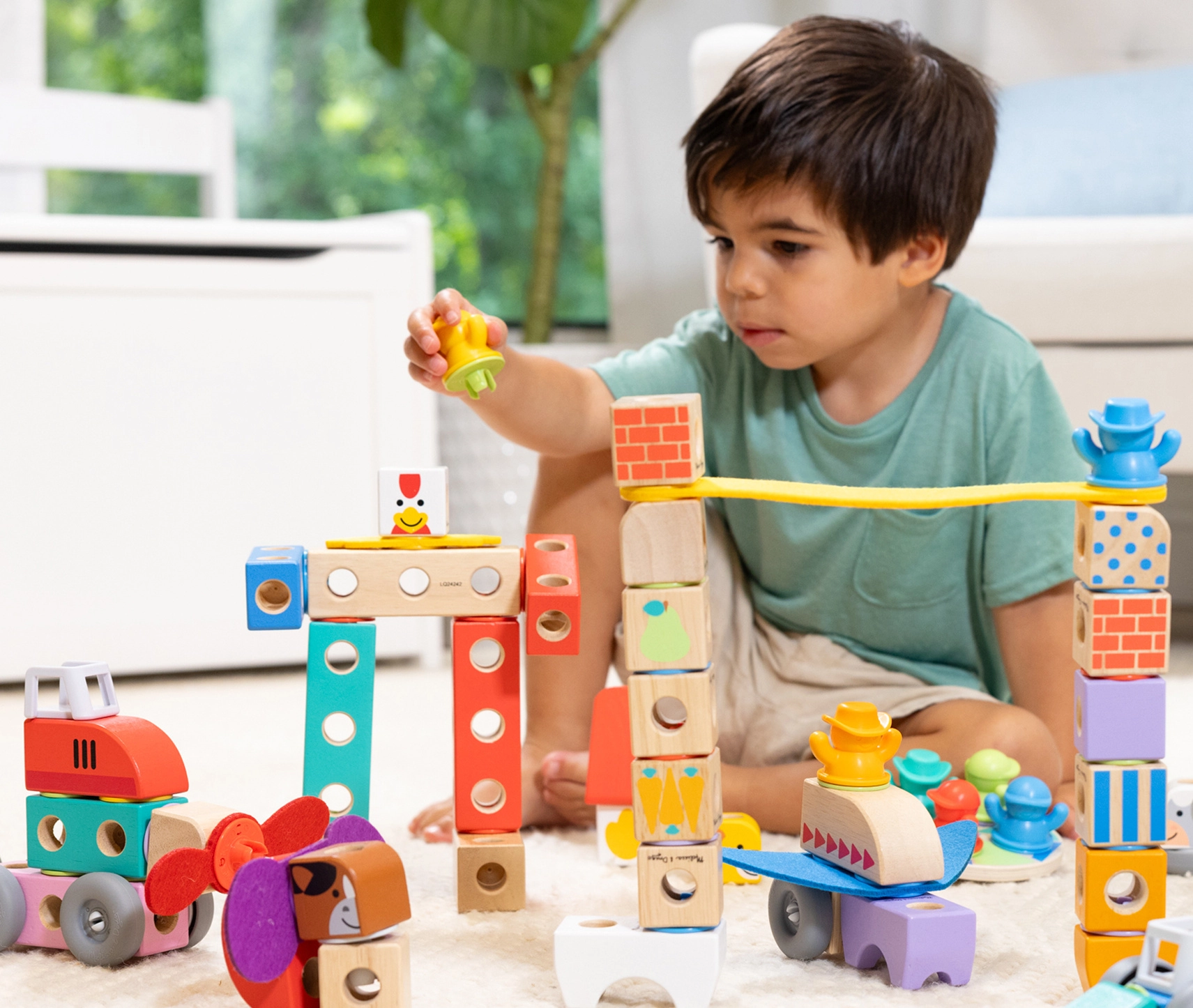 De bouwset ontwikkelt belangrijke vaardigheden: fijne motoriek, oog-handcoördinatie, creativiteit en logisch denken. Kinderen kunnen stapelen, verbinden, draaien en rijden met hun creaties. Hoogwaardig FSC-gecertificeerd hout en een duurzame afwerking zorgen voor een lange levensduur, zelfs bij dagelijks spelen.