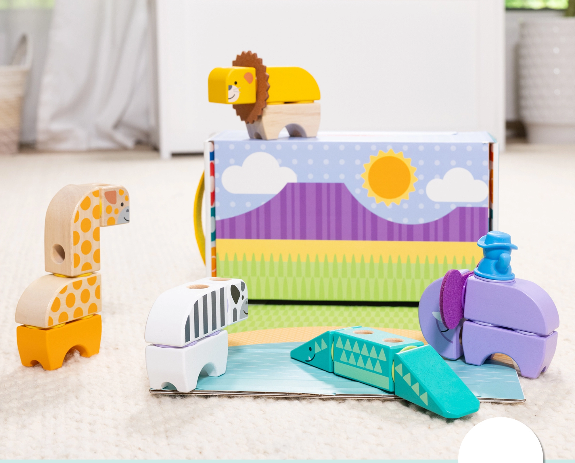Kinderen kunnen eenvoudig delen van dieren (leeuw, zebra, giraffe, krokodil, nijlpaard) stapelen en combineren en zo unieke figuren creëren die de fantasie en het vertellen van verhalen prikkelen.