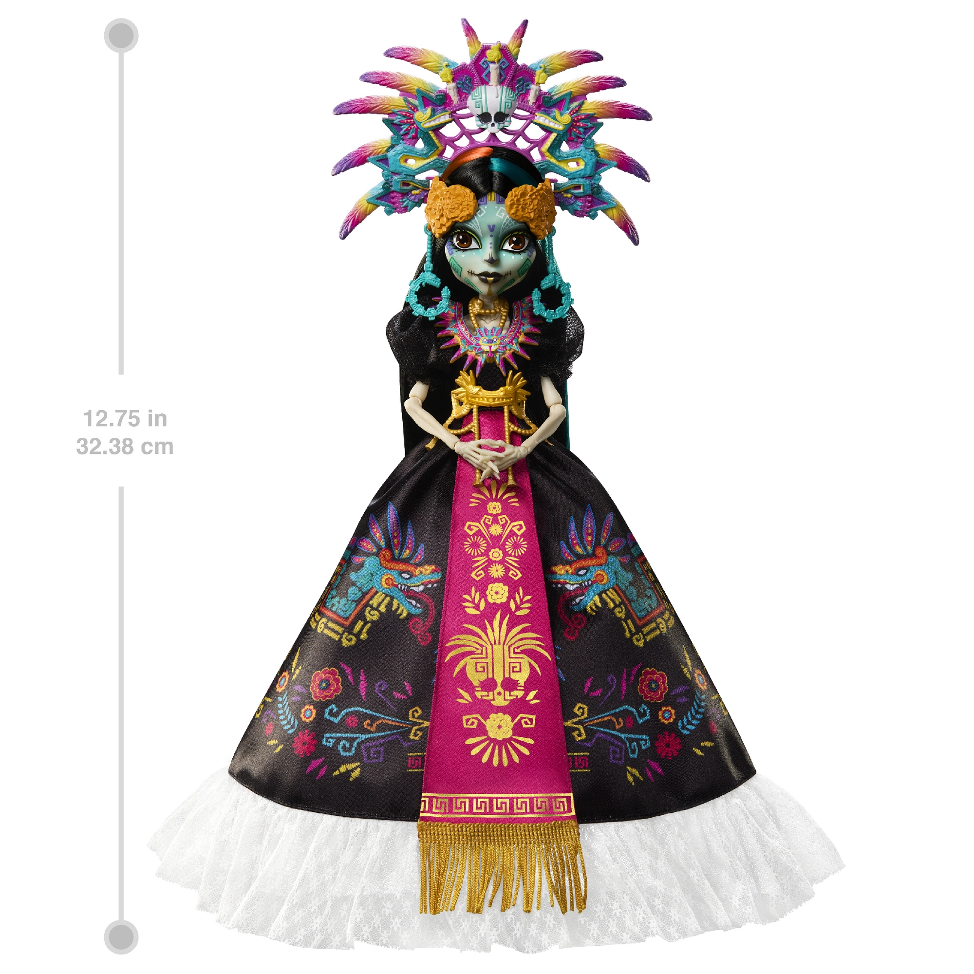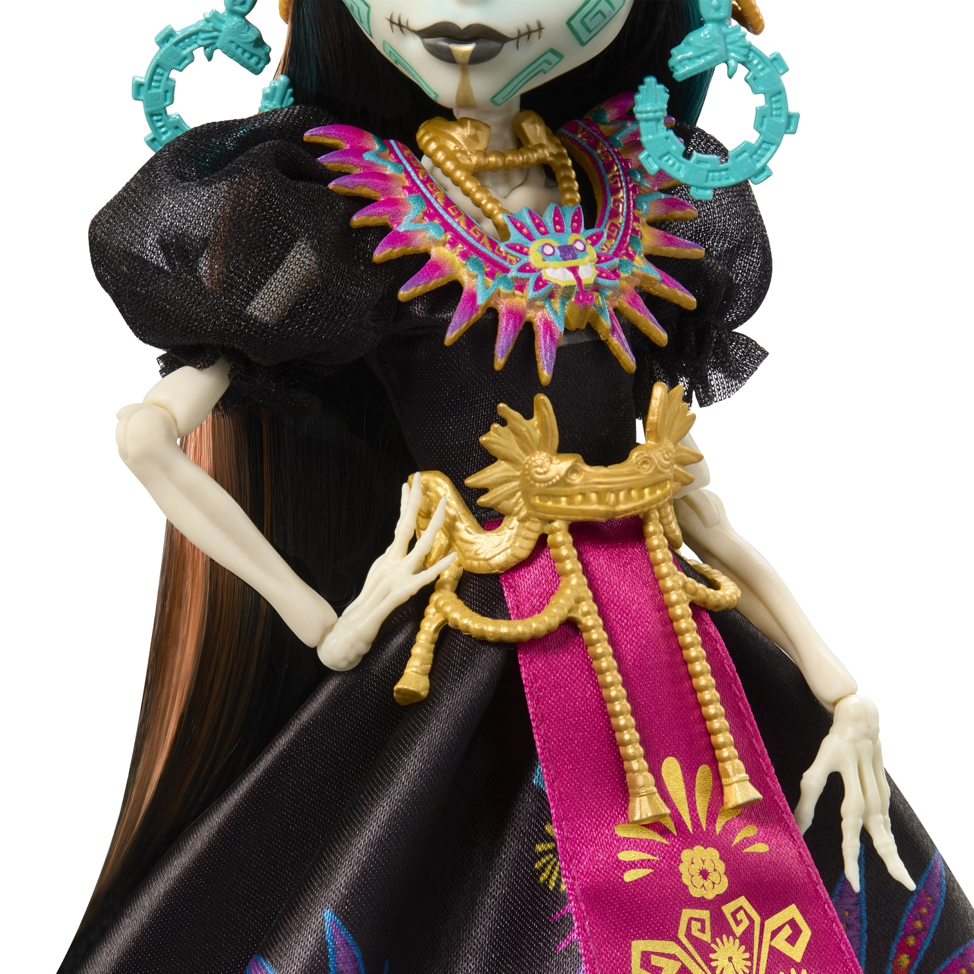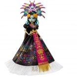 De collectie-editie Monster High Skullector eert het Mexicaanse feest Día de Muertos. Skelita Calaveras betovert met een lange zwarte jurk met satijnen glans, kleurrijke prints en een opvallende magentakleurige sjerp met gouden franjes. Een dominante gevederde haarband, opvallende sieraden en gedetailleerde facepaint maken haar tot een uitzonderlijk stuk voor liefhebbers van design en cultuur.