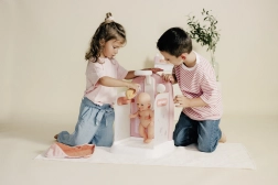 Ontdek realistische poppenverzorging met de elegante roze-witte BABY NURSE douchecabine. Wanneer je op de knop drukt, stroomt er water uit de douche, zodat kinderen de pop echt kunnen “wassen” en daarna inwikkelen in de zachte handdoek met capuchon. Dankzij de praktische houder kan de pop zelfstandig onder de douche staan en hebben kinderen hun handen vrij voor wassen en afspoelen.