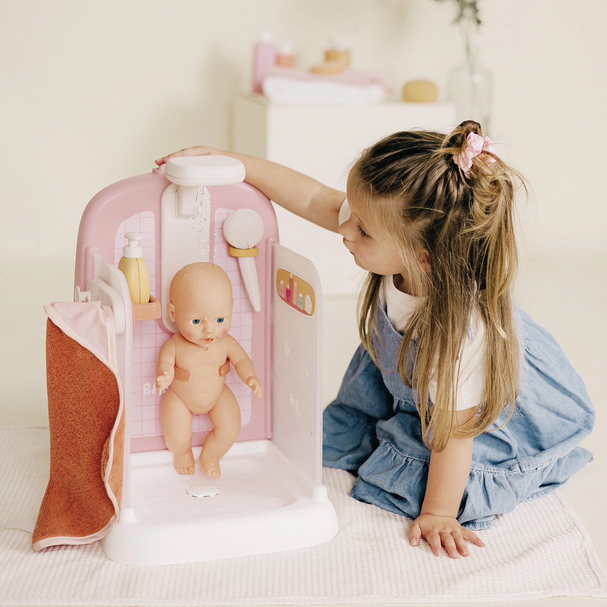 De douchecabine heeft een stabiele basis, een houder voor de pop en plankjes voor flesjes en handdoek voor zorgeloos spelen.