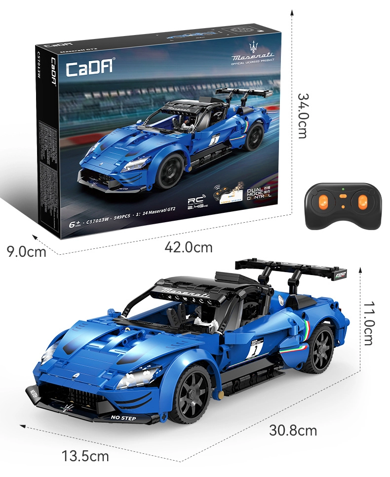 Deze technische CaDA-bouwset combineert het plezier van creëren met moderne besturingstechnologie. Na het bouwen krijg je een zorgvuldig uitgewerkt model van de MASERATI GT2 met functionele besturing en rubberen wielen, dat er geweldig uitziet op de plank en tegelijk klaar is voor actievolle ritten. Dankzij de RC-bediening via controller of telefoon is het plezier altijd binnen handbereik.