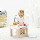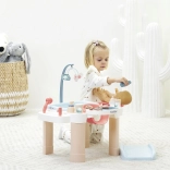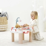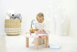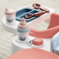 De tafel in zachte pasteltinten is ideaal voor de kinderkamer. Het badje met schenktuit, organizers voor flesjes en toebehoren en het neerklapbare deksel van het verschoningsvlak zorgen voor overzicht en orde. 13 stuks accessoires (flesjes, lepeltje, potjes e.d.) maken het spel boeiend en realistisch.