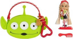 De mini pop met lang blond haar draagt een modieuze set met het Alien-motief uit TOY STORY. De outfit wordt aangevuld met sportieve schoentjes en een mini handtasje in de vorm van het hoofd van de Alien. Er is ook een grote roze draagtas met Alien-motief inbegrepen, waarin je de pop en haar spulletjes makkelijk kunt opbergen – ideaal om thuis mee te spelen én voor op reis.