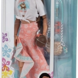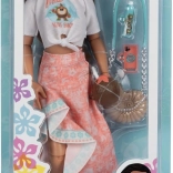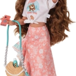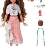 De outfit in roze en turquoise tinten met oceaanprint wordt aangevuld met een zonnebril, schoudertas, drankje, haarband en smartphone. Afneembare kleding en schoenen maken eenvoudig omkleden en stylen mogelijk, terwijl de stevige constructie zorgt voor een lange levensduur en veilig speelplezier.