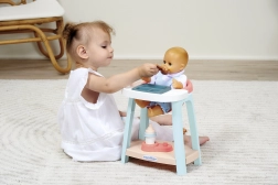 Stabiele hoge kinderstoel met verdeeld bordje, bekertje en bestek maakt het mogelijk om de pop realistisch te “voeden”. Afgeronde randen en een stevige constructie zorgen voor veilig speelplezier.