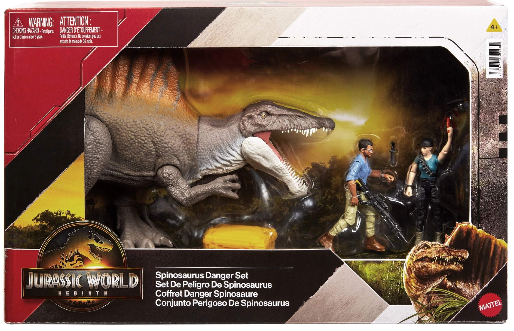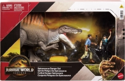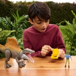 Deze set van Mattel bevat een realistisch vormgegeven Spinosaurus met opvallende rugzeil, opengaande bek en beweegbare gewrichten. Twee menselijke figuren met accessoires – wapens, gereedschap en een gele transportkist – vergroten de speelmogelijkheden en maken het creëren van spannende achtervolgingen en reddingsmissies mogelijk.