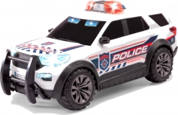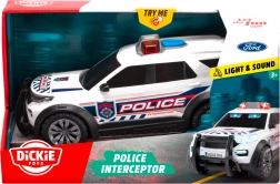 De kinderlijke politiewagen FORD INTERCEPTOR van Dickie Toys biedt realistische actie met licht- en geluidseffecten. De witte carrosserie met opvallende details, grote kunststof wielen voor voorwaartse rit en knipperende zwaailichten samen met de sirene creëren een authentieke sfeer van een politieactie.