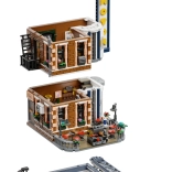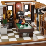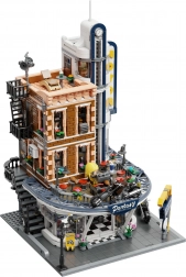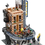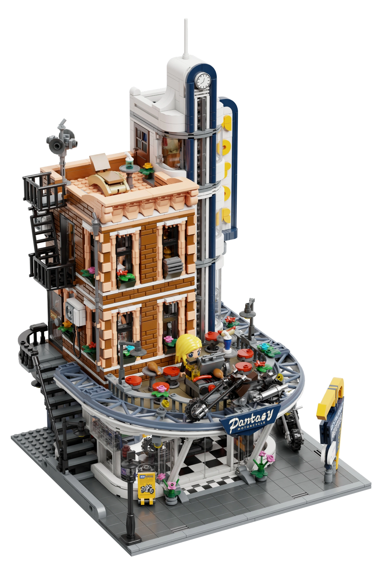 Hoekrestaurant met motorwinkel, minifiguren en straataccessoires biedt tal van scenario’s voor spel en display.