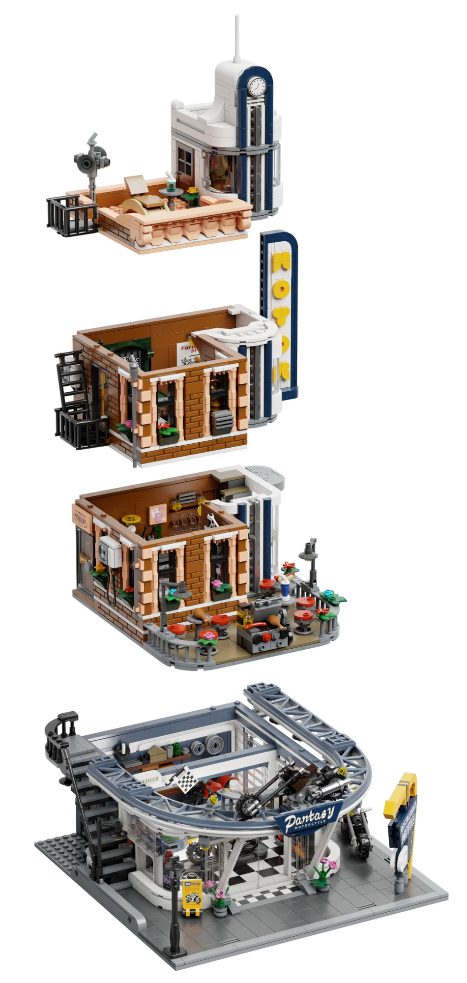Het gebouw blinkt uit door preciese afwerking, authentieke accessoires en talloze scènes die de verbeelding prikkelen. Perfect voor motorliefhebbers en verzamelaars van stadsbouwsets.