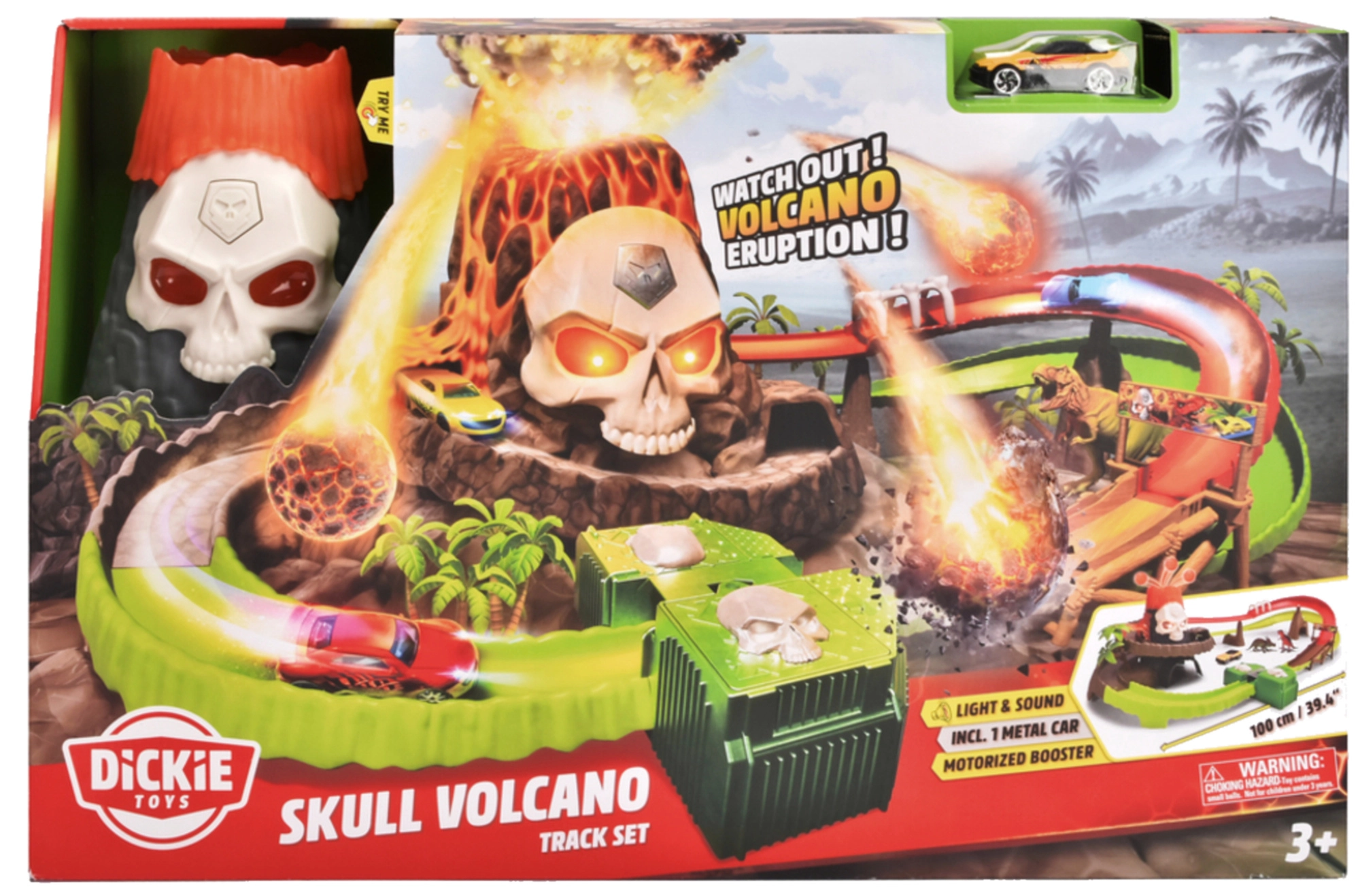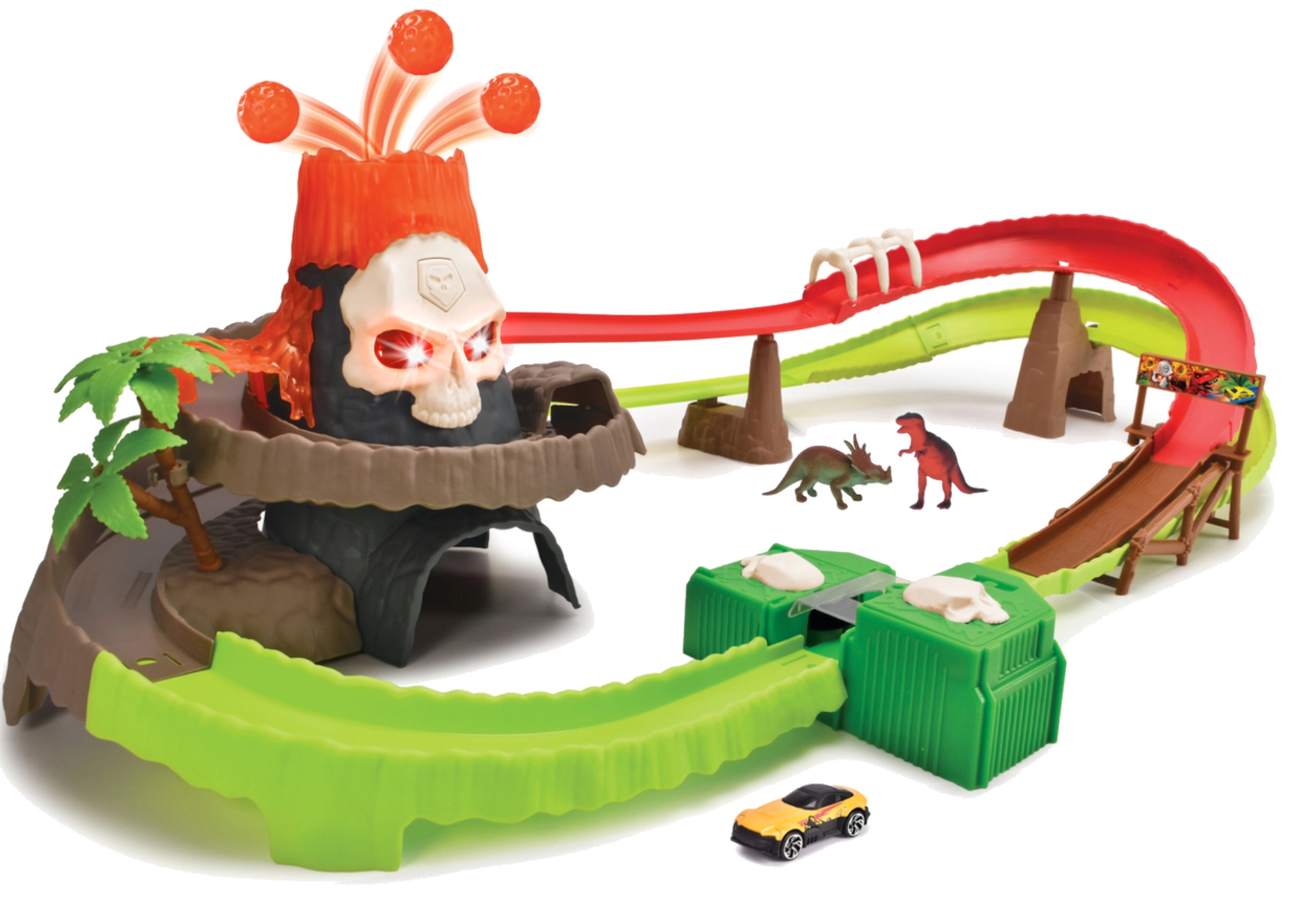 De actiese t “Schedelvulkaan” zorgt voor spanning bij elke rit. Het metalen autootje op schaal 1:64 raast door de grot, activeert de vulkaanuitbarsting en rijdt door spiraalvormige secties vol obstakels. Voor de sfeer zorgen de lichtgevende ogen van de schedel en de geluidseffecten, die worden geactiveerd met de zilverkleurige knop.