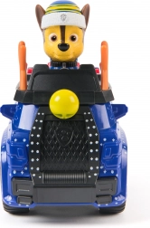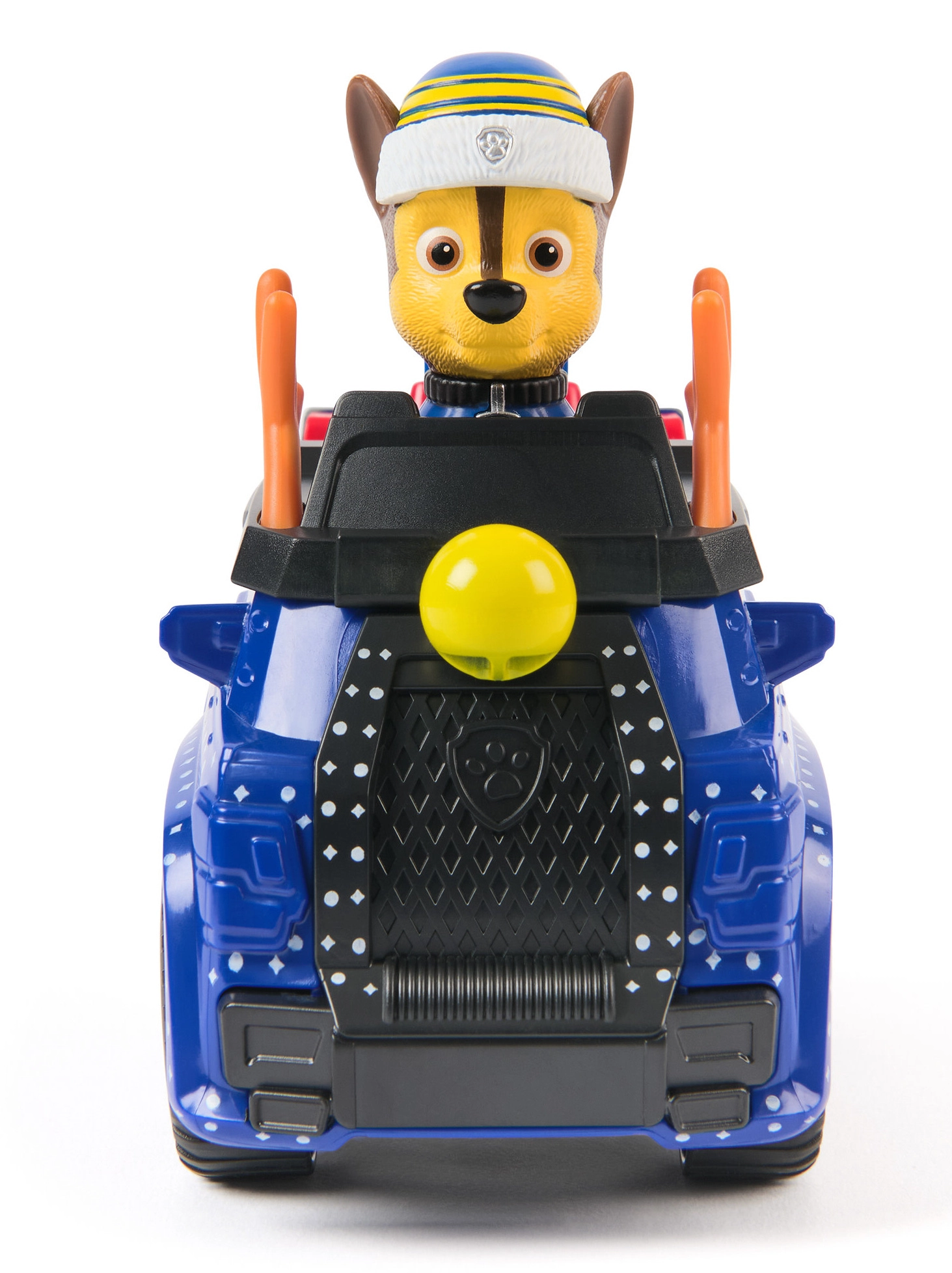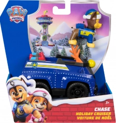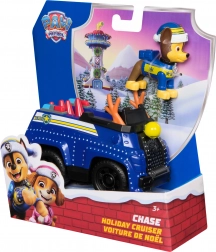Gedetailleerde blauwe auto met kerstaccenten en bewegende wielen. Het CHASE-figuurtje met wintermuts zit direct in de cockpit en is klaar voor actie.