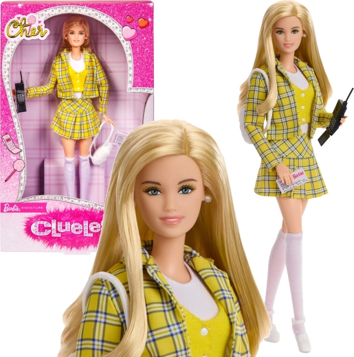 Vier de 30e verjaardag van de cultfilm Clueless met de verzamelpop Barbie Signature Cher Horowitz. De stijlicoon van de jaren 90 schittert in haar gele geruite outfit met een geplooide rok, colbert en kniekousen. Met realistische accessoires – een witte rugzak, een “mobieltje” met antenne en een tijdelijk rijbewijs. De pop heeft gearticuleerde gewrichten om te poseren en is ideaal voor display en collectie.