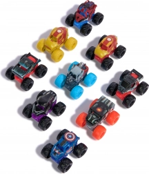 - 3 mini-monstertrucks (Thor, Black Panther, Iron Man)