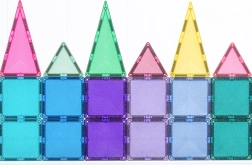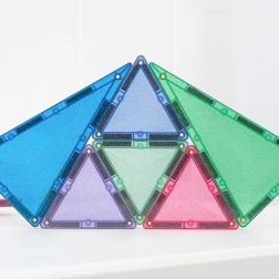 De set bevat 48 hoogwaardige magnetische onderdelen met een glinsterend effect, die dankzij magneten langs de randen aan alle kanten aantrekken en stabiele constructies kunnen dragen. De transparant gekleurde tegels van duurzaam ABS, vrij van BPA en ftalaten, zijn ideaal voor veilig spelen vanaf 3 jaar en zorgen voor een plezierige “klik” bij het verbinden.