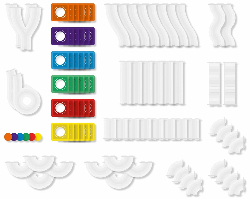 Helder buiswerk, bochten, S-vormen en Y-splitsingen maken het mogelijk de beweging van knikkers te volgen en snelheid, zwaartekracht en oorzaak-gevolg te onderzoeken bij verschillende opstellingen.