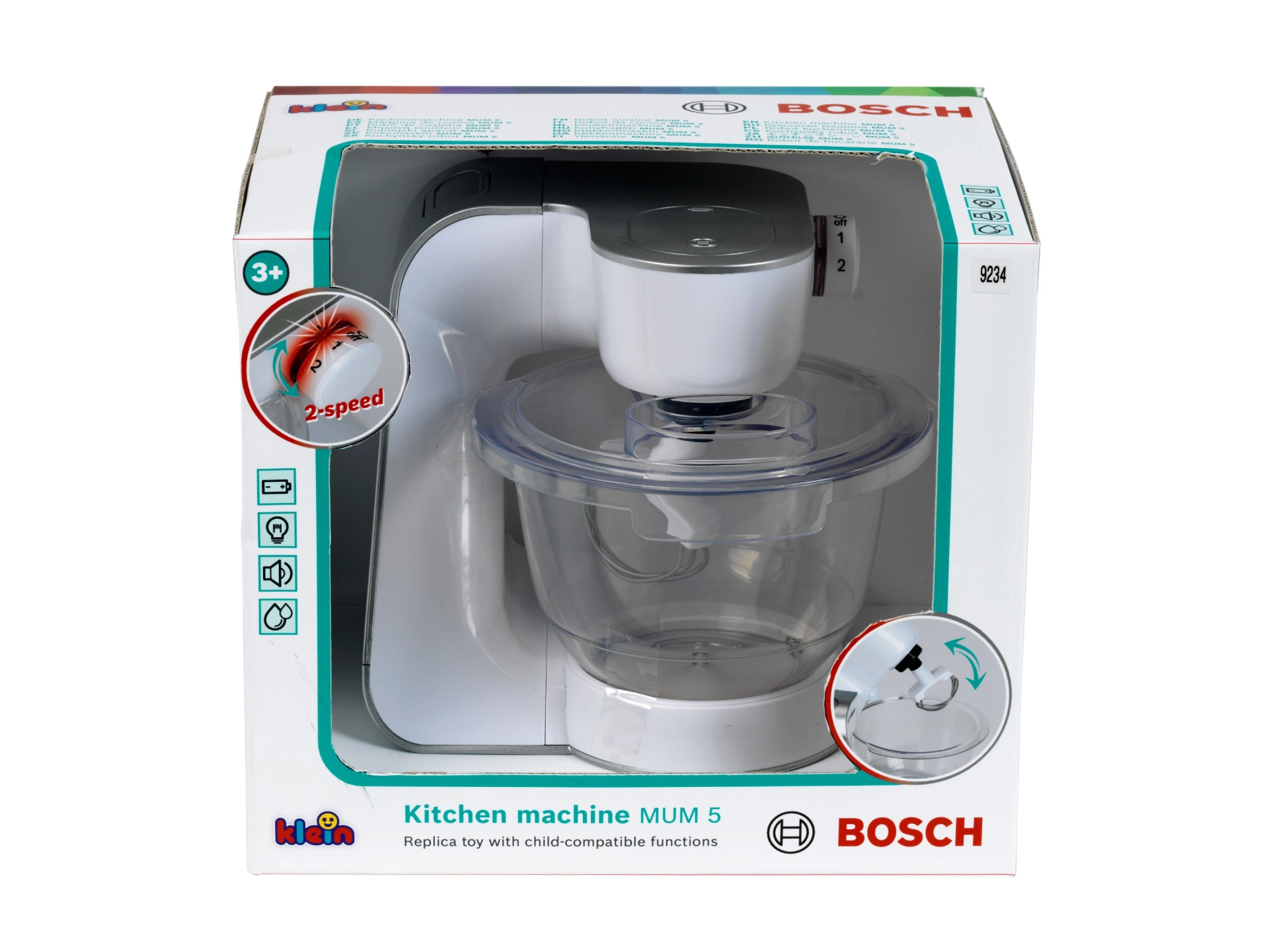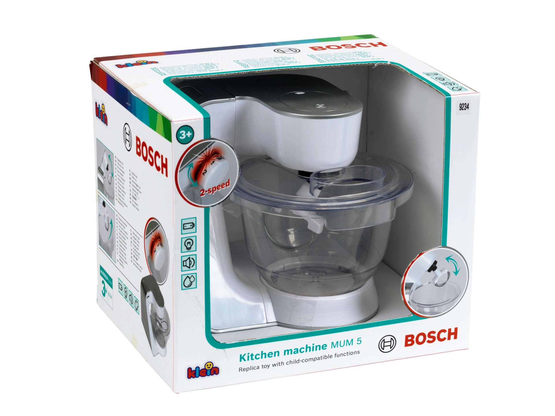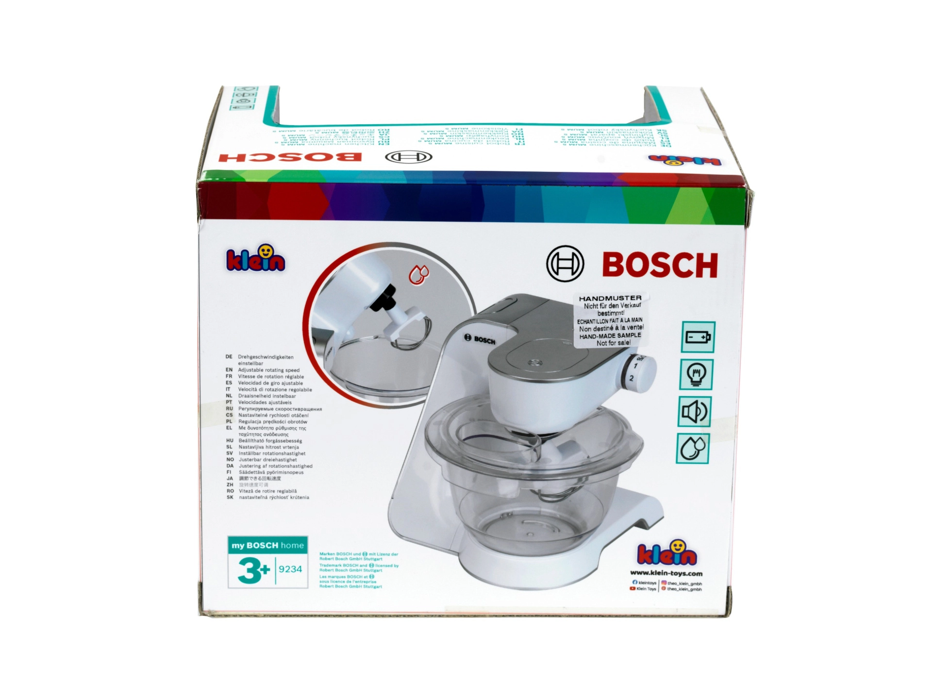 Realistische kinderkeukenmachine met officiële BOSCH-licentie van fabrikant KLEIN, ideaal voor kleine chefs. Met licht- en geluidseffecten, 2 snelheden, een kantelbare arm en een transparante kom met afneembare deksel. Veilige uitvoering, duurzame materialen en compact formaat zorgen voor urenlang creatief speelplezier in de keuken.