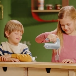Geef kinderen plezier alsof ze in een echte keuken staan. De gelicentieerde BOSCH-mixer in zilveren uitvoering bootst een echt apparaat natuurgetrouw na: na het indrukken van de knop draaien de gardes en de schuifschakelaar imiteert het instellen van de snelheid. Dankzij de afneembare opzetstukken leren kinderen ook gewoontes rondom orde en netheid.