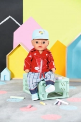 Stijlvolle outfit voor BABY born poppen van 36 cm met een motorlook: een rode jas in lederlook met een berenprint, grijs‑blauwe broek, blauwe sneakers en een pet met eendje Berta. Easy fit-snit voor eenvoudig omkleden, inclusief een kledinghanger.