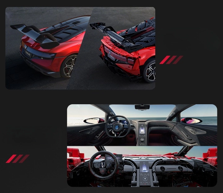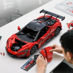 Getrouwe rode carrosserie met bedrukte details, sportvelgen en een aerodynamische vleugel. Afmetingen na montage ca. 60,5 × 29,5 × 16 cm – een blikvanger in elke collectie.