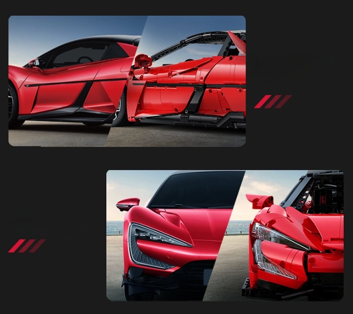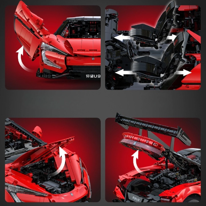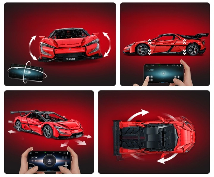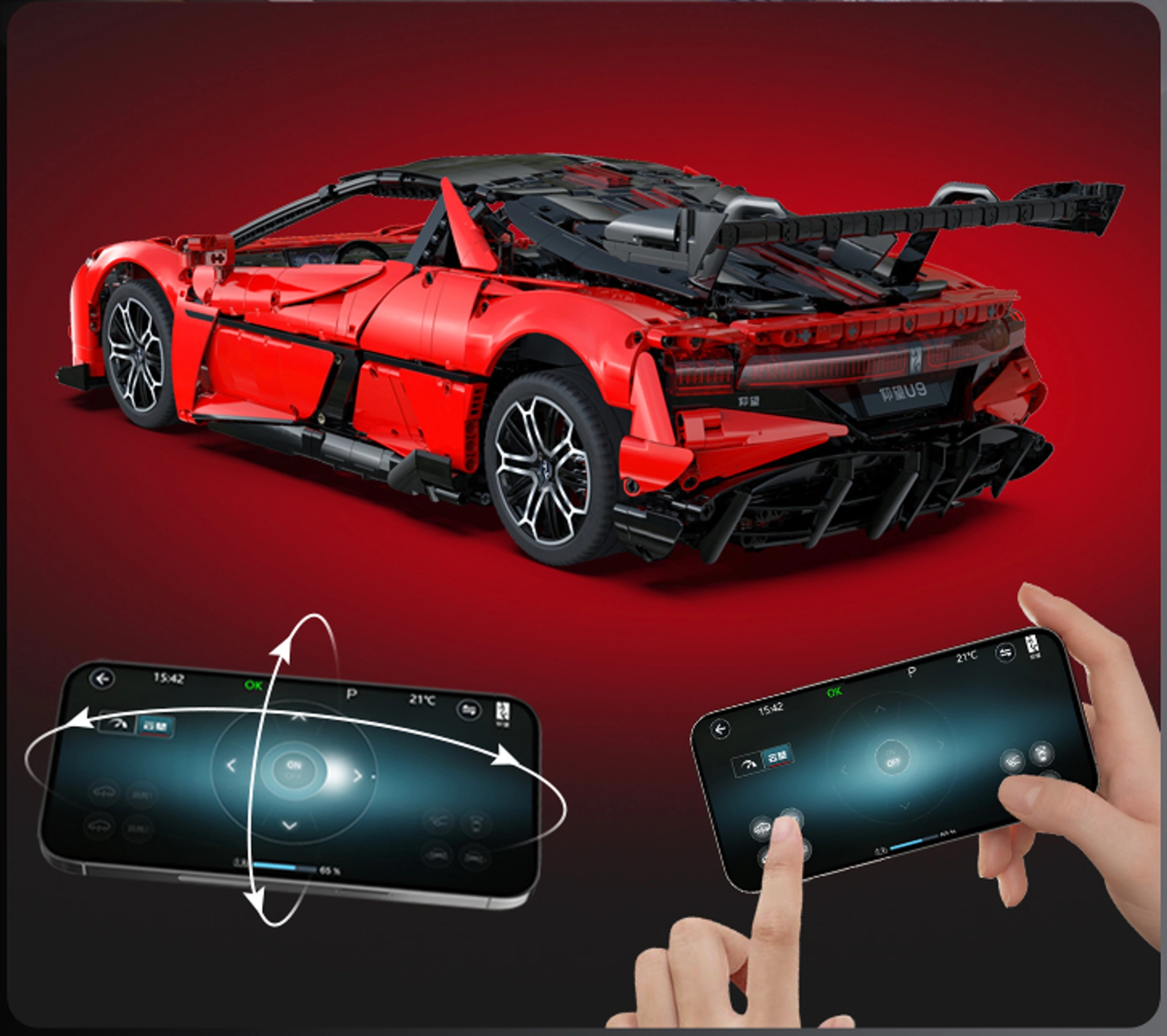 Ervaar een combinatie van nauwkeurig bouwen en slimme fun. Dit officieel gelicenseerde model BYD YANGWANG U9 op schaal 1:8 meet na montage ongeveer 60,5 × 29,5 × 16 cm en vangt natuurgetrouw de aerodynamische lijnen, de rode carrosserie met bedrukte details en het sportieve onderstel. Met Bluetooth-appbediening rijdt het model tot 3,8 km/u en beheerst het voor- en achteruit rijden en sturen.