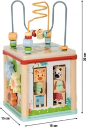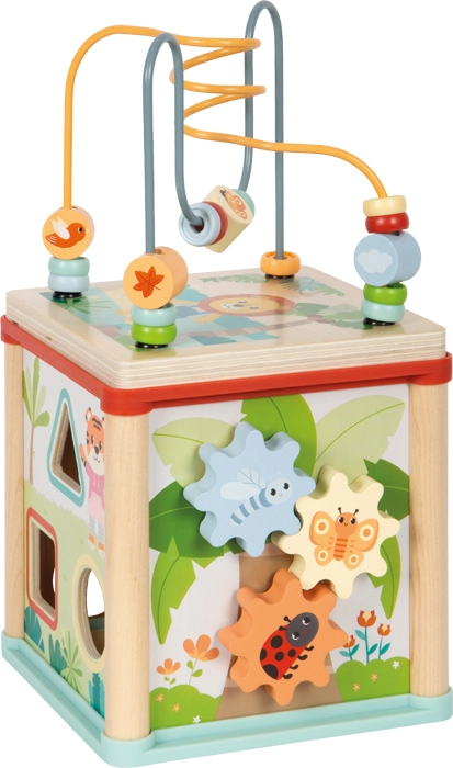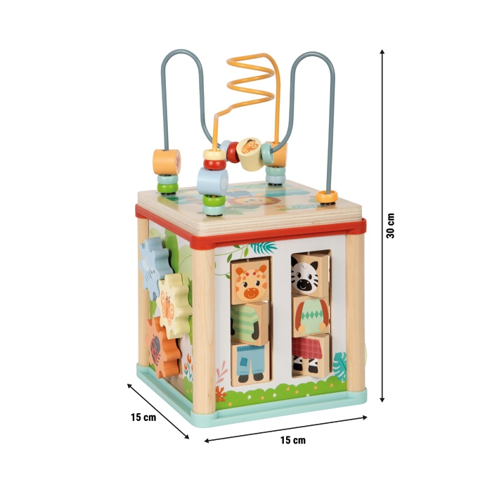 Deze hoogwaardige motorische kubus van 100% FSC-hout combineert meerdere leuke activiteiten in één compact speelcentrum. Dankzij het afneembare deksel met kralenlabyrint, dat omgekeerd binnenin kan worden geplaatst, is het ideaal voor kleinere kinderkamers. Zorgvuldig afgeronde randen, een stabiele constructie en aangename kleuren met een dierenthema creëren een veilige en stimulerende omgeving om te ontdekken.