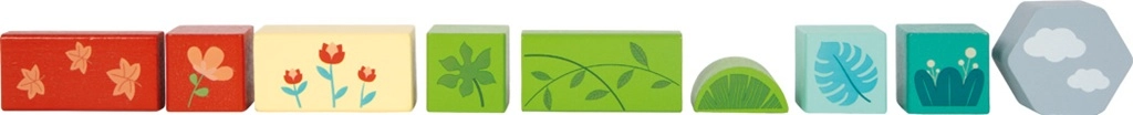 De set bevat blokken, cilinders, bogen en bedrukte onderdelen in natuurlijke en pastelkleuren die de fantasie en het ruimtelijk denken stimuleren.