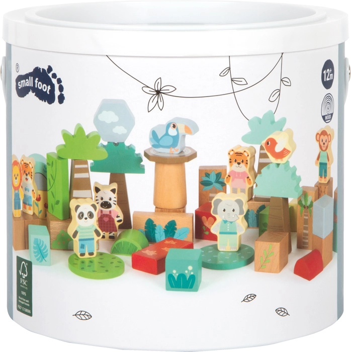 Deze betoverende bouwset brengt een jungle vol dieren en fantasierijke scènes naar de kinderkamer. Je vindt er blokken in verschillende vormen en maten, bedrukte onderdelen met bladeren en planten en lieve figuren zoals een tijger, panda, aapje en vogels. Kinderen kunnen torens, bruggen en hele landschappen bouwen en ondertussen hun fantasie ontwikkelen en eigen verhalen vertellen.