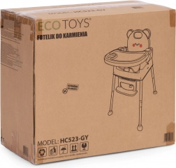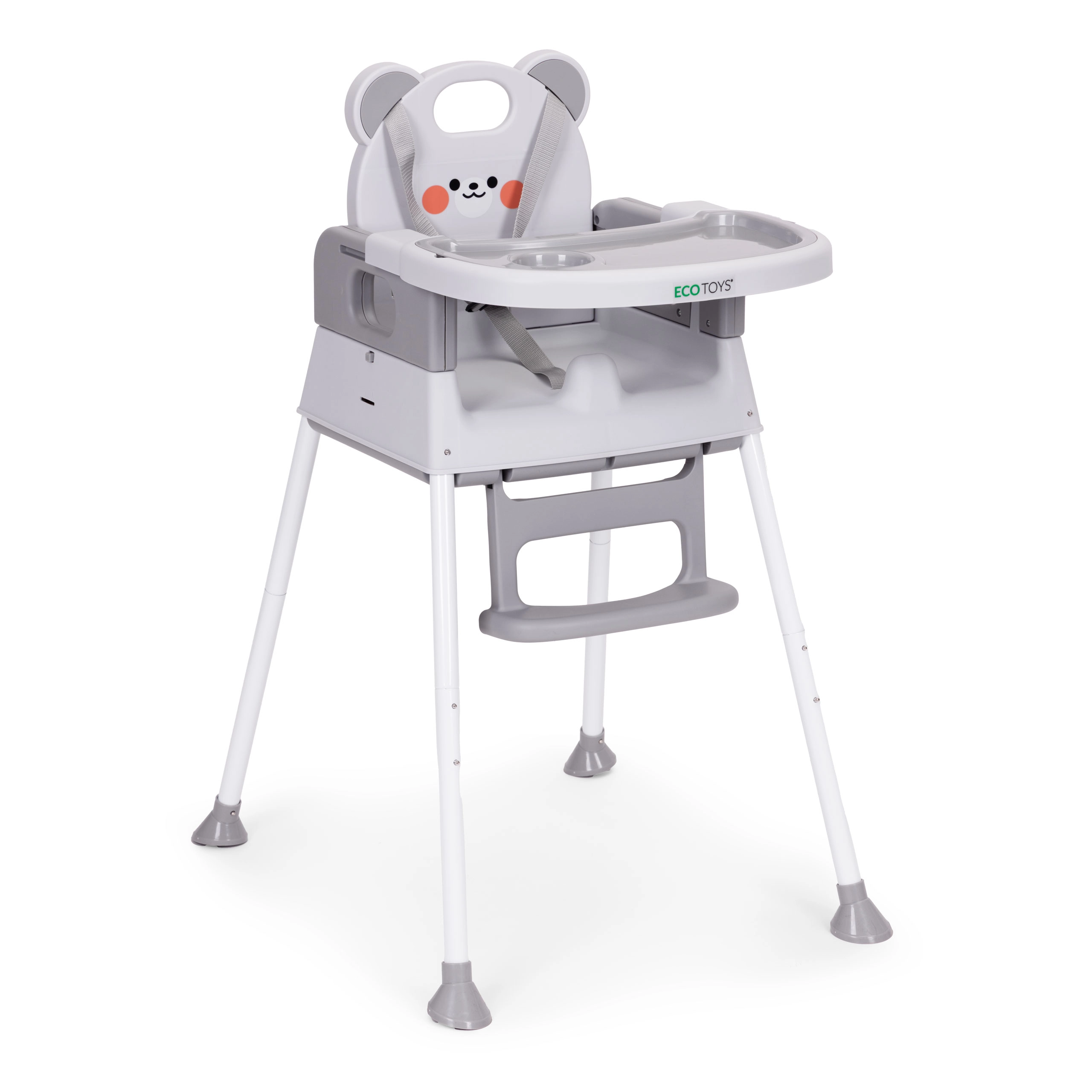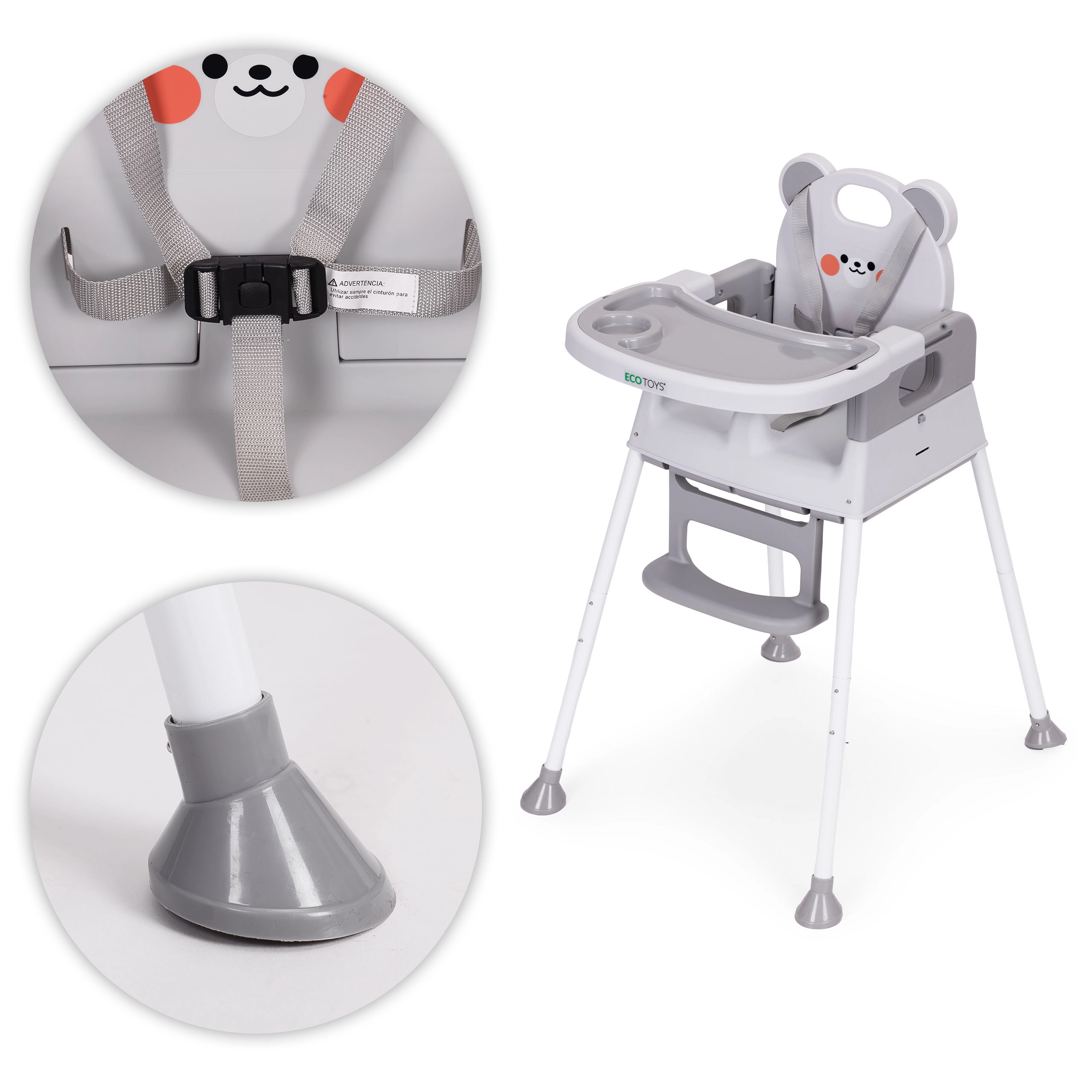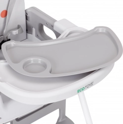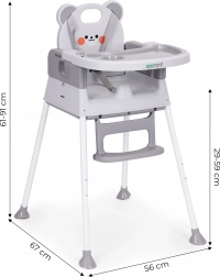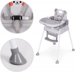 Voor de veiligheid zorgen de 5-puntsgordel, de tussenbeen-veiligheidsstop tegen wegglijden en antislippootjes. Het brede dubbele dienblad met opstaande randen en bekerhouder is verstelbaar; de bovenste laag is eenvoudig afneembaar en vaatwasmachinebestendig. De voetsteun en ergonomische zitting zorgen voor een correcte zithouding en comfort tijdens eten en spelen.