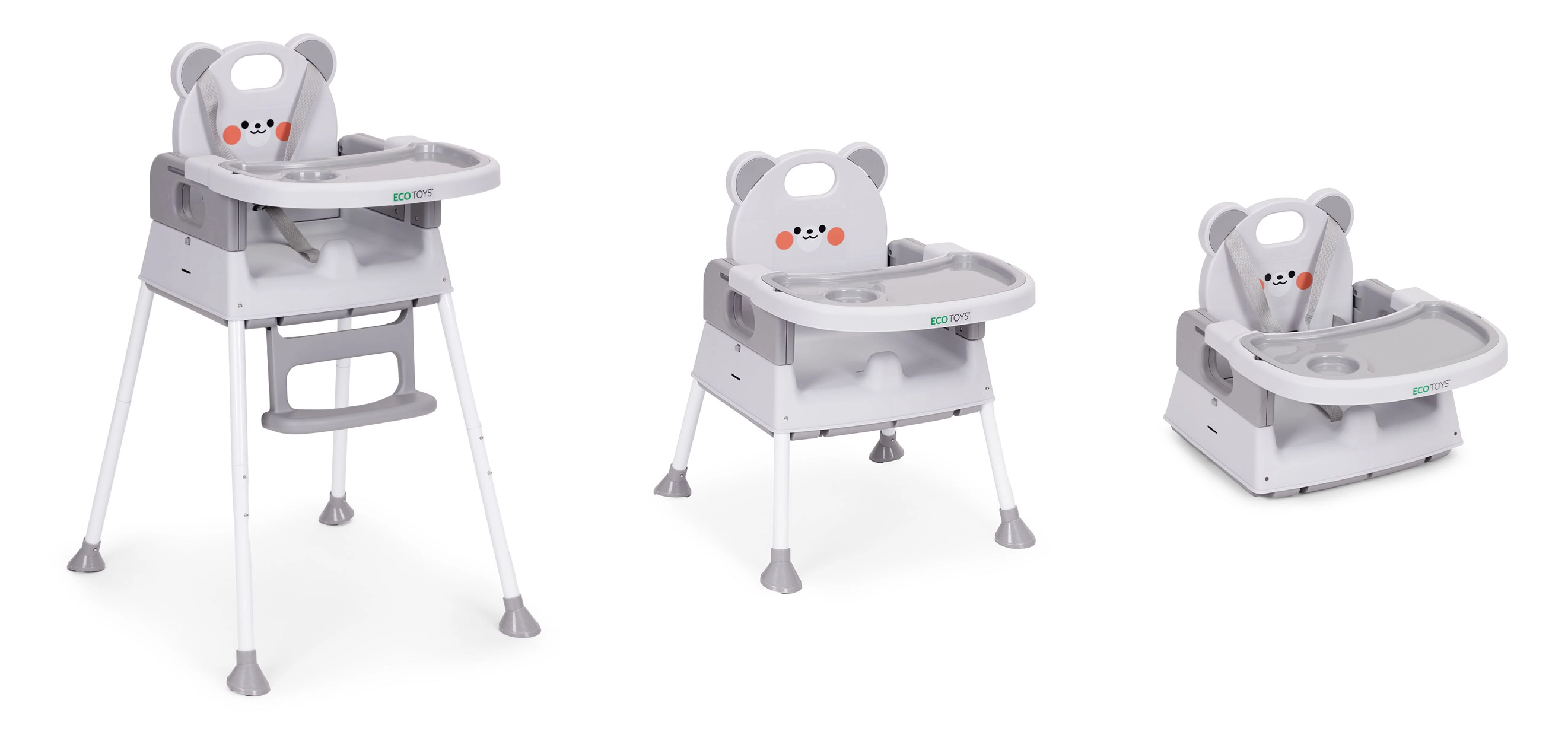 Eén stoel voor drie situaties. Hoog voeren, laag zitten om te spelen of als veilige verhoger op een eetkamerstoel – ideaal voor kleine ruimtes en op reis.