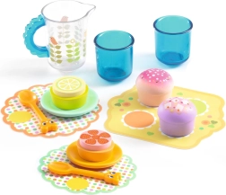 Bekertjes, theepot, bordjes en lepeltjes in heldere kleuren nodigen uit tot rollenspel, inschenken en het serveren van lekkernijen.