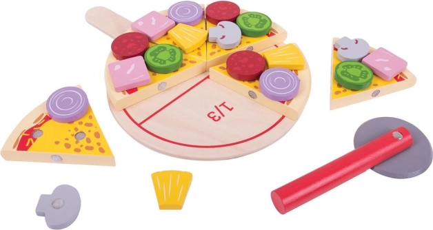 De houten snijpizza is het ideale speelgoed voor creatief rollenspel. Kinderen kunnen “bakken”, snijden en serveren, de pizza versieren met champignons, ui, paprika of salami en zo hand-oogcoördinatie trainen. De plank met breukmarkeringen helpt speels begrippen als 1/2, 1/3 of 1/6 uit te leggen.
