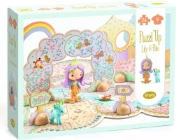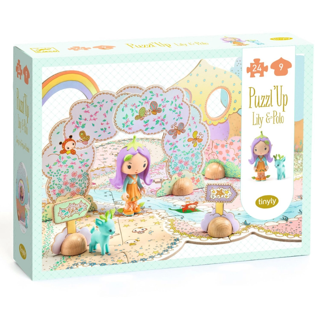 Puzzl’Up Tinyly van DJECO combineert het plezier van puzzelen met de fantasie van open spel. Van losse kartonnen stukjes maak je een schilderachtige scène met bruggetjes, een riviertje, sterren en dieren. Dankzij de vrijstaande kartonnen decoraties en de schattige figuurtjes verandert de voltooide scène in een speelwereld die kinderen steeds opnieuw tot leven brengen met hun eigen verhalen.