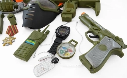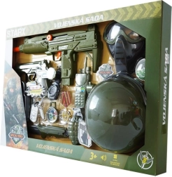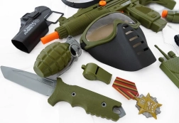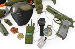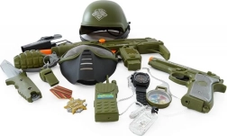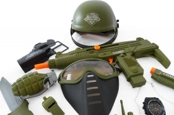 Set voor de kleine soldaat met helm, pistool en andere accessoires.