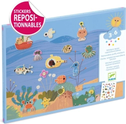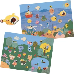 Deze creatieve set bevat twee geïllustreerde achtergronden – de onderwaterwereld en het bos met een vijver – en een vel lieve stickers met visjes, een krab, een duikboot, een bootje, bosdieren en andere motieven. Kinderen kunnen de stickers naar wens verplaatsen en steeds nieuwe verhalen bedenken.