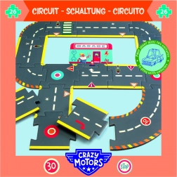 Bouw voor kinderen hun eigen snelheidsstad met de gigantische puzzelracebaan CRAZY MOTORS. Stevige stukken van duurzaam materiaal zijn eenvoudig te leggen en vormen realistische wegen met rijstroken, verkeerslichten, borden, parkeerplaats en een rotonde. Ideaal voor spel met autootjes en voor de ontwikkeling van fijne motoriek, fantasie en verkeerseducatie.