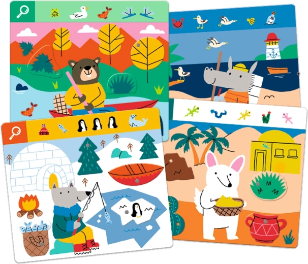 Geïllustreerde kaarten met omgevingen zoals bos, zee of woestijn bieden tal van verborgen objecten om te vinden en zorgen voor urenlang geconcentreerd speelplezier.