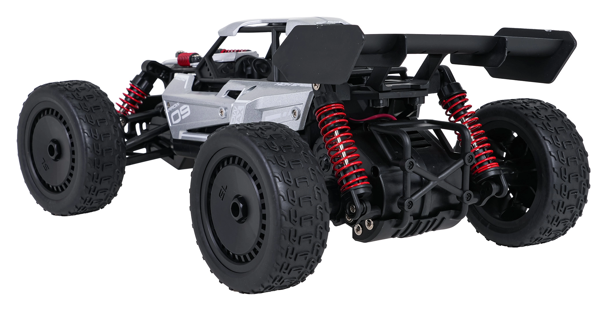 Dankzij de 2,4 GHz-frequentie is er geen storing, zodat u tegelijk met andere modellen kunt rijden. Variabele besturing en grote rubberen banden maken precieze manoeuvres en zeker bochtenwerk mogelijk. In de verpakking vindt u een oplaadbare 7,4 V-accu en een USB-kabel voor gemakkelijk opladen.
