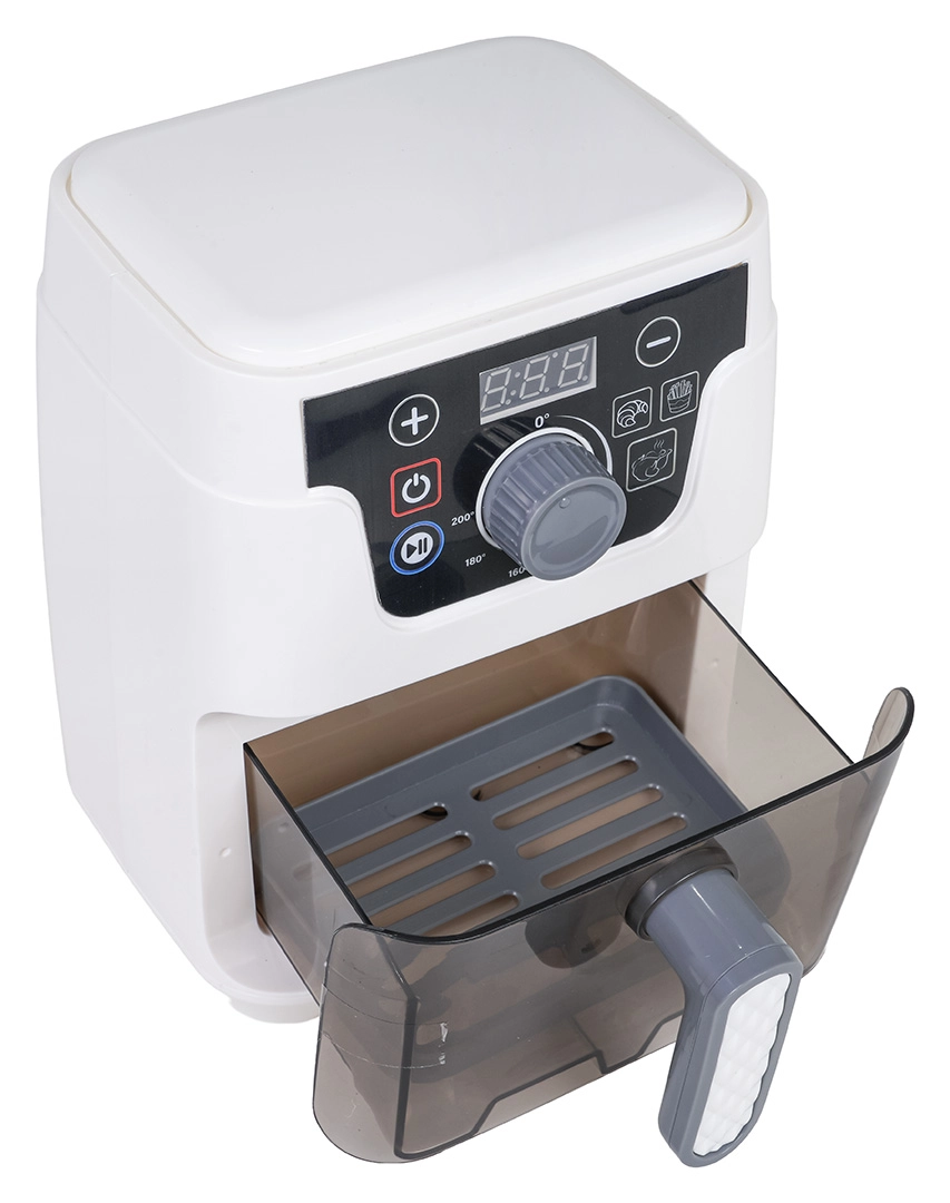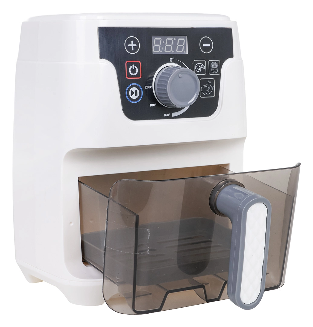 Deze gedetailleerde kinder-airfryer ziet eruit en werkt als een echt apparaat: met verlichte mand, digitaal display en geluiden voor bakken, frituren en openen/sluiten van de lade. Automatische programma’s tonen de tijd op het display (broodje 2:50, frietjes 2:00, kip 3:00) en na afloop schakelt het toestel automatisch uit met een akoestische melding.