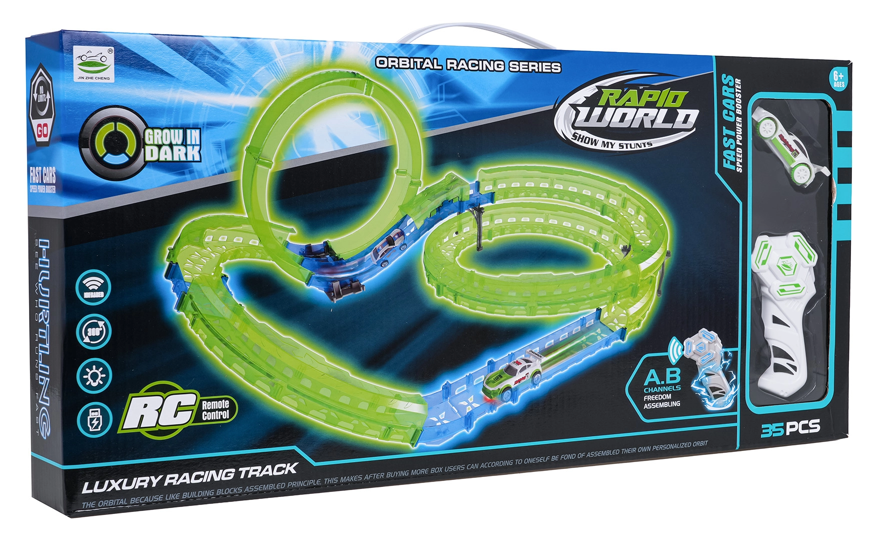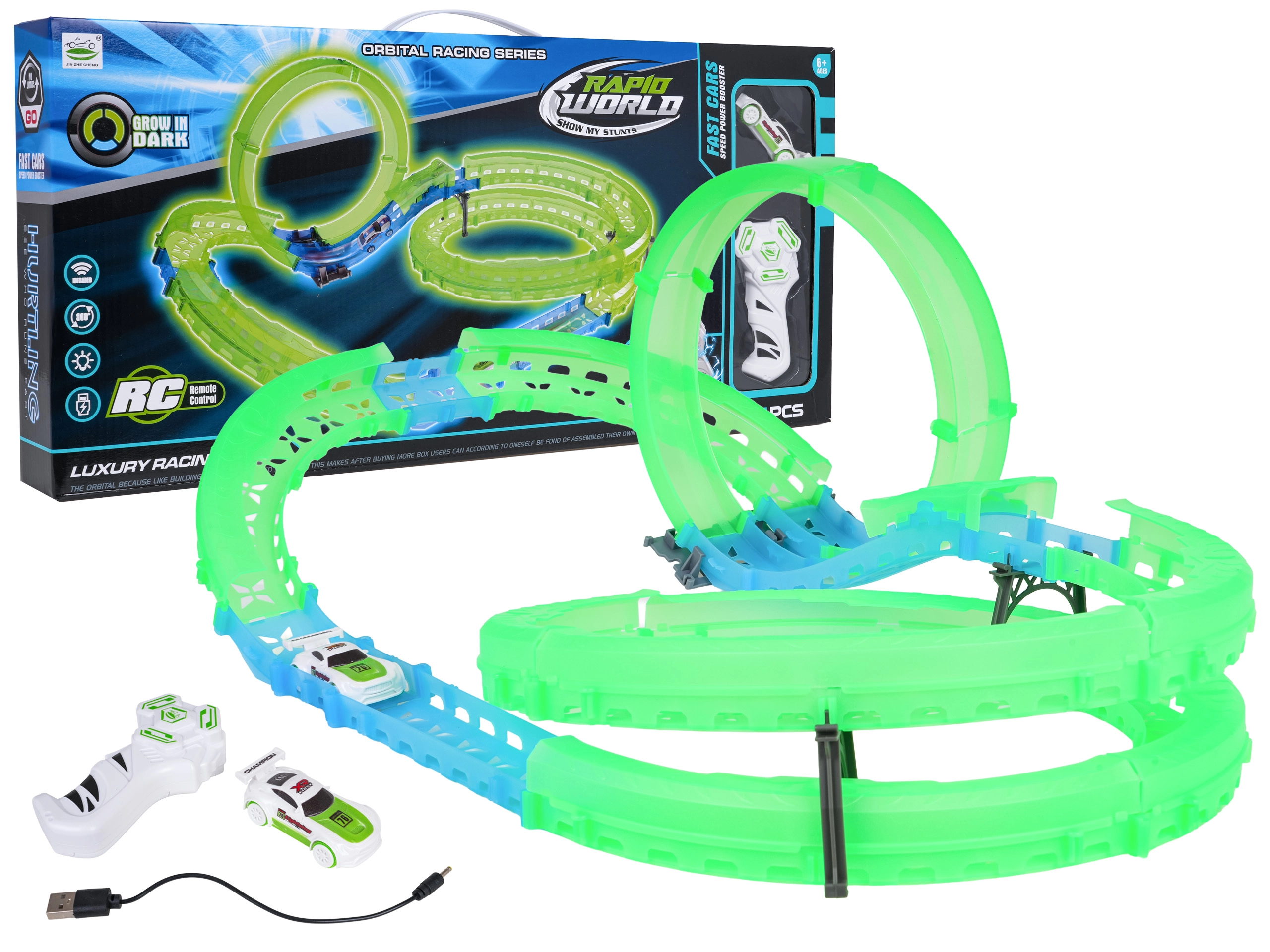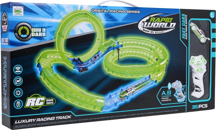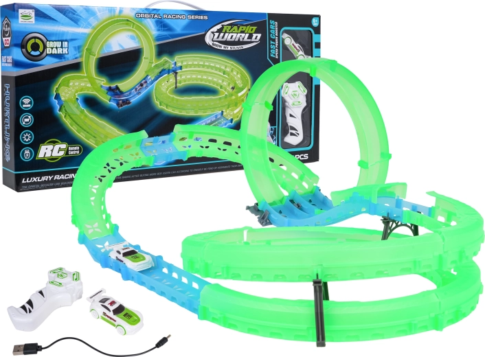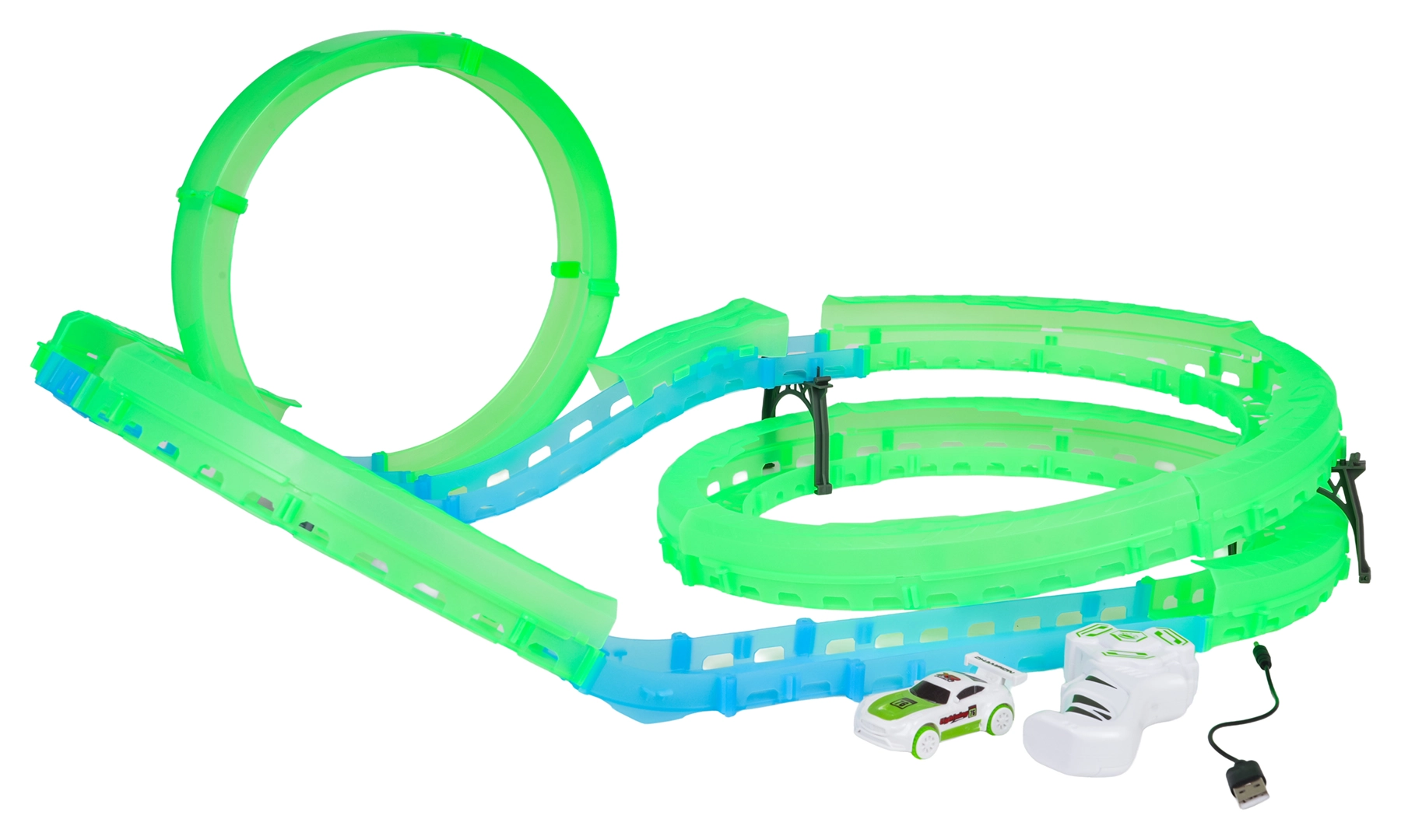 Start thuis voluit met racen met de lichtgevende racebaan voor kinderen vanaf 6 jaar. De set bevat een RC-autootje met LED-verlichting, een fluorescerende baan die in het donker oplicht en een afstandsbediening. Het autootje wordt opgeladen via USB, de controller gebruikt AAA-batterijen. Geweldige pret die coördinatie, verbeelding en fijne motoriek ontwikkeld.