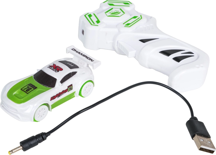 De pistoolgrip-controller zorgt voor comfortabel sturen, het autootje wordt via USB opgeladen. Controller: 2× AAA (niet inbegrepen). Autootje: accu 3,7 V.
