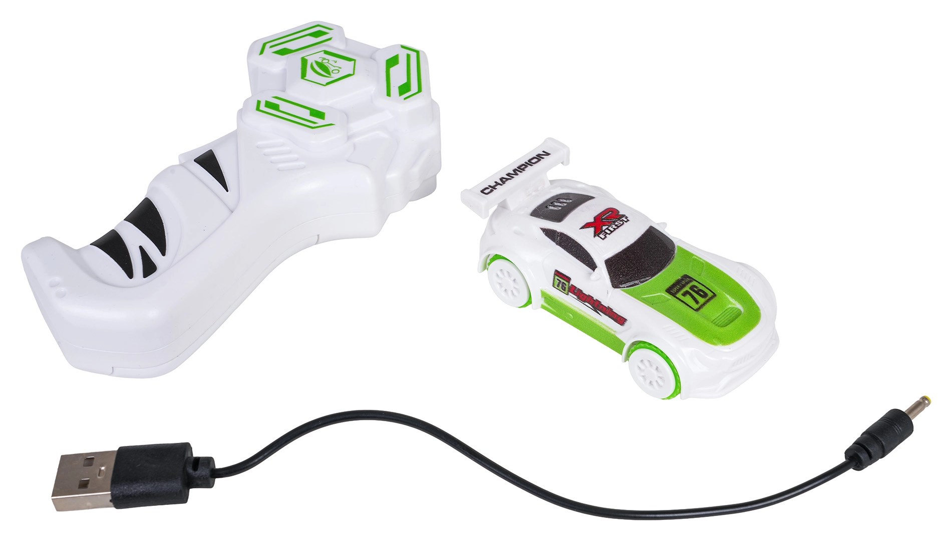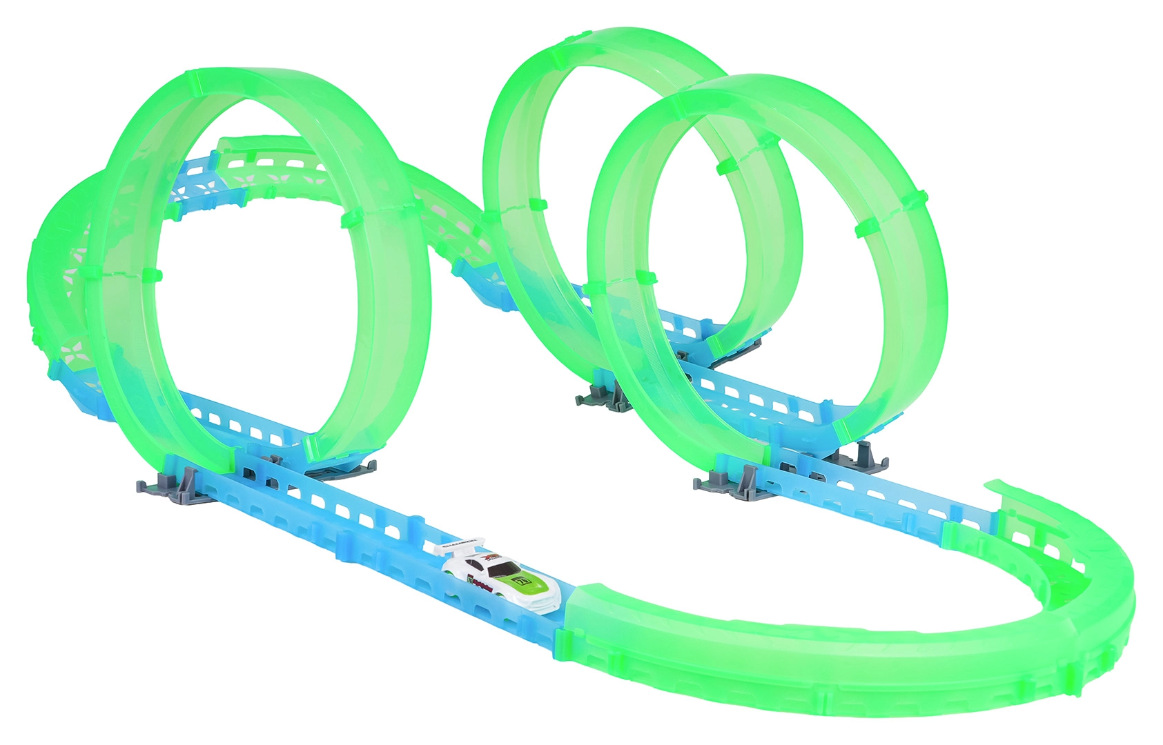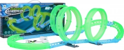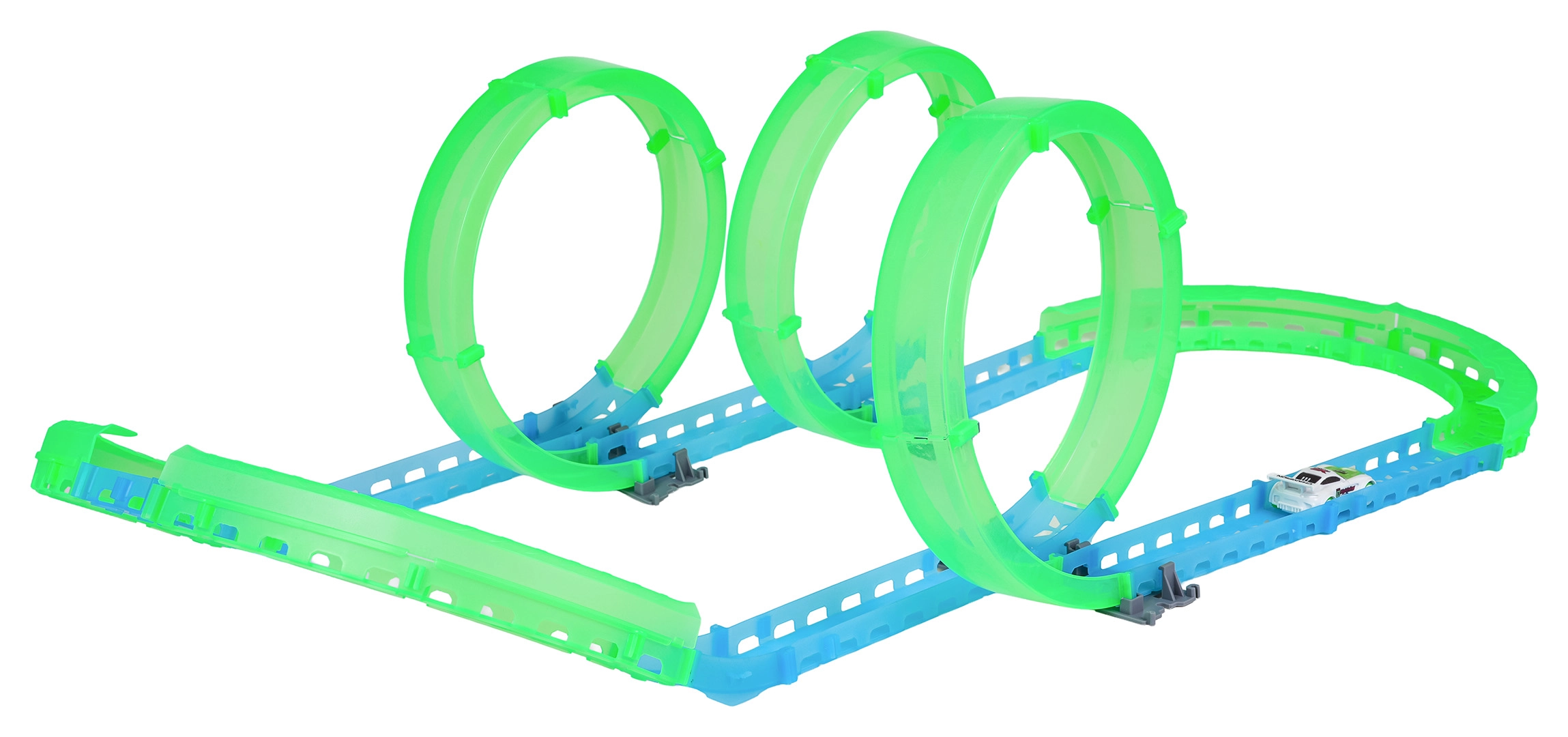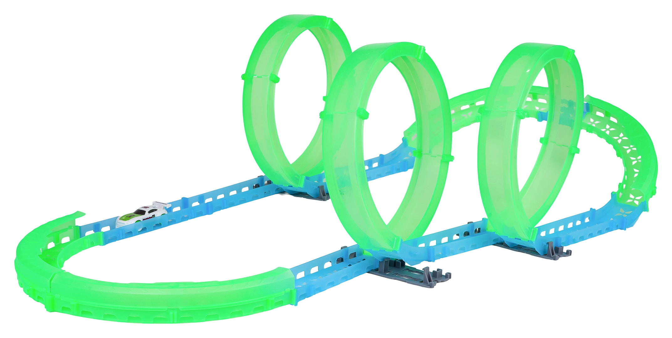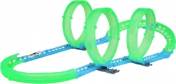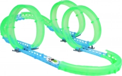 Bouw je eigen stuntbaan en geniet van het racen, ook na zonsondergang. De fluorescerende onderdelen lichten op in het donker en het kleine RC-autootje rijdt vooruit over de voorbereide baan. Dankzij de LED-verlichting ontstaan tijdens het rijden spectaculaire lichtsporen.