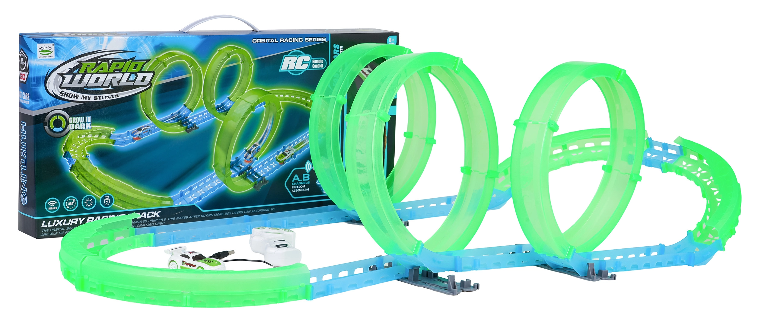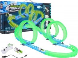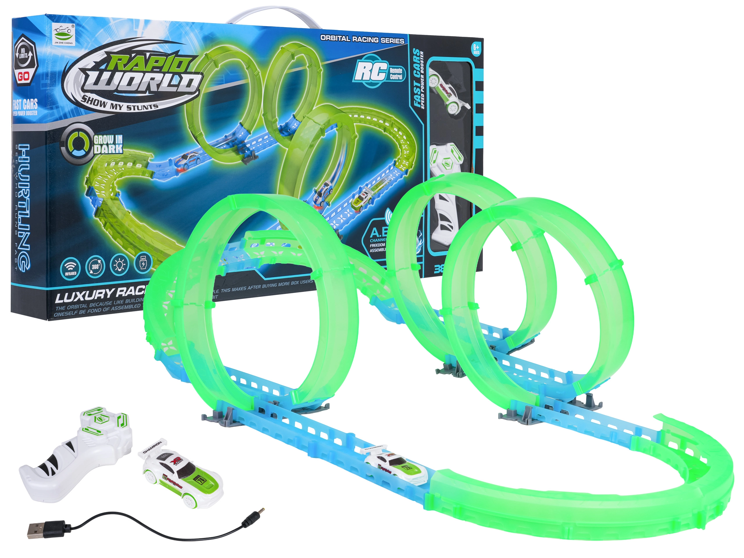 Lichtgevende racebaan voor kinderen vanaf 6 jaar biedt een actievolle rit met een RC-autootje met LED-onderverlichting. De fluorescerende baan licht op in het donker, het autootje wordt opgeladen via USB en de afstandsbediening werkt op 2× AAA-batterijen (niet inbegrepen). Eenvoudige montage, geweldige lichteffecten en plezier dat coördinatie en verbeeldingskracht ontwikkelt.