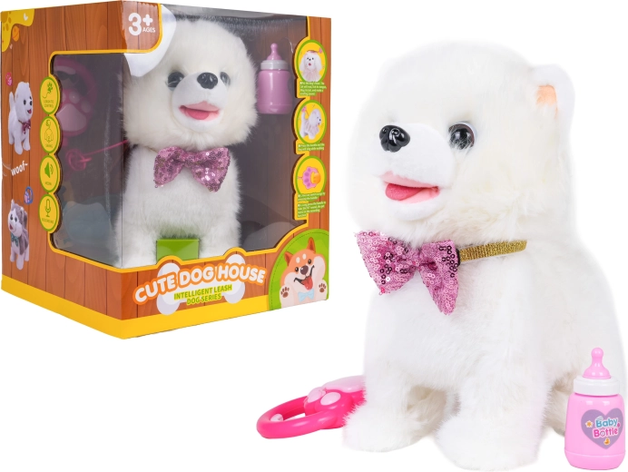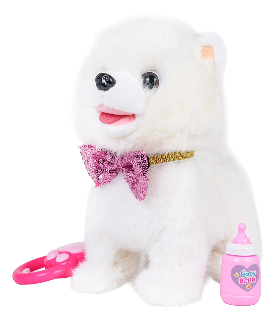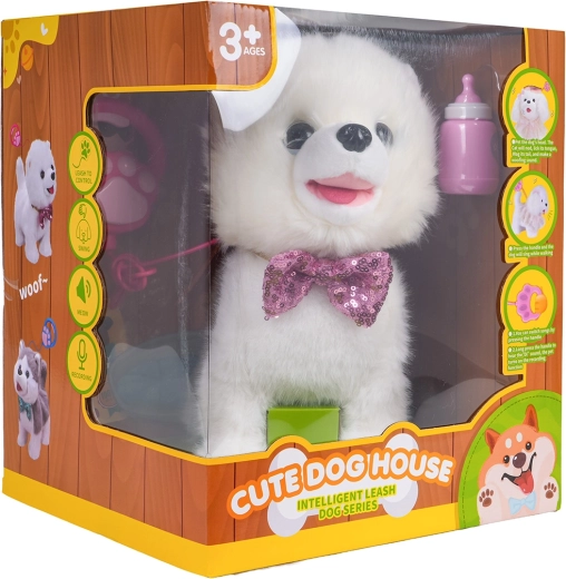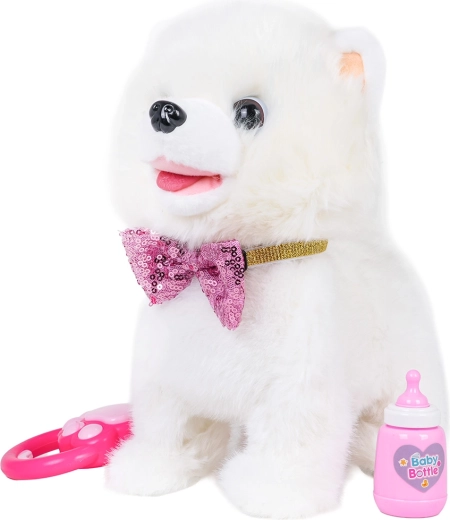 Schattige witte interactieve hond voor kinderen vanaf 3 jaar, vol plezier en knuffelmomenten. Gemaakt van zachte en veilige materialen, kan lopen, blaffen, met de staart kwispelen, met het hoofd knikken en zelfs met het tongtje likken. Dankzij de controller/lus reageert hij op een druk, loopt hij op het ritme van de muziek en heeft hij een opname- en afspeelfunctie, zodat hij je woorden schattig herhaalt. Inclusief een voedingsflesje voor nog realistischer spel.