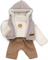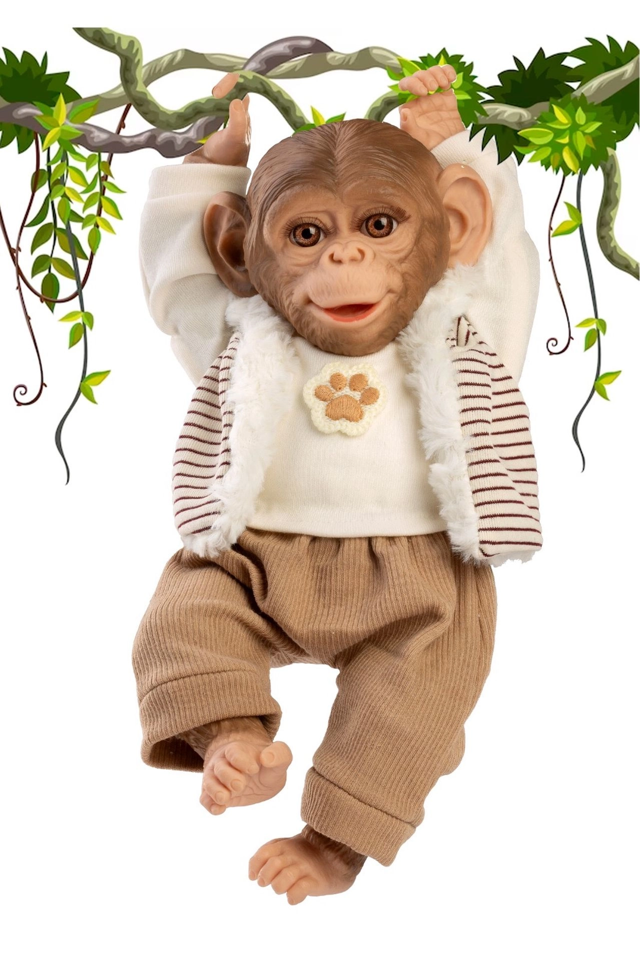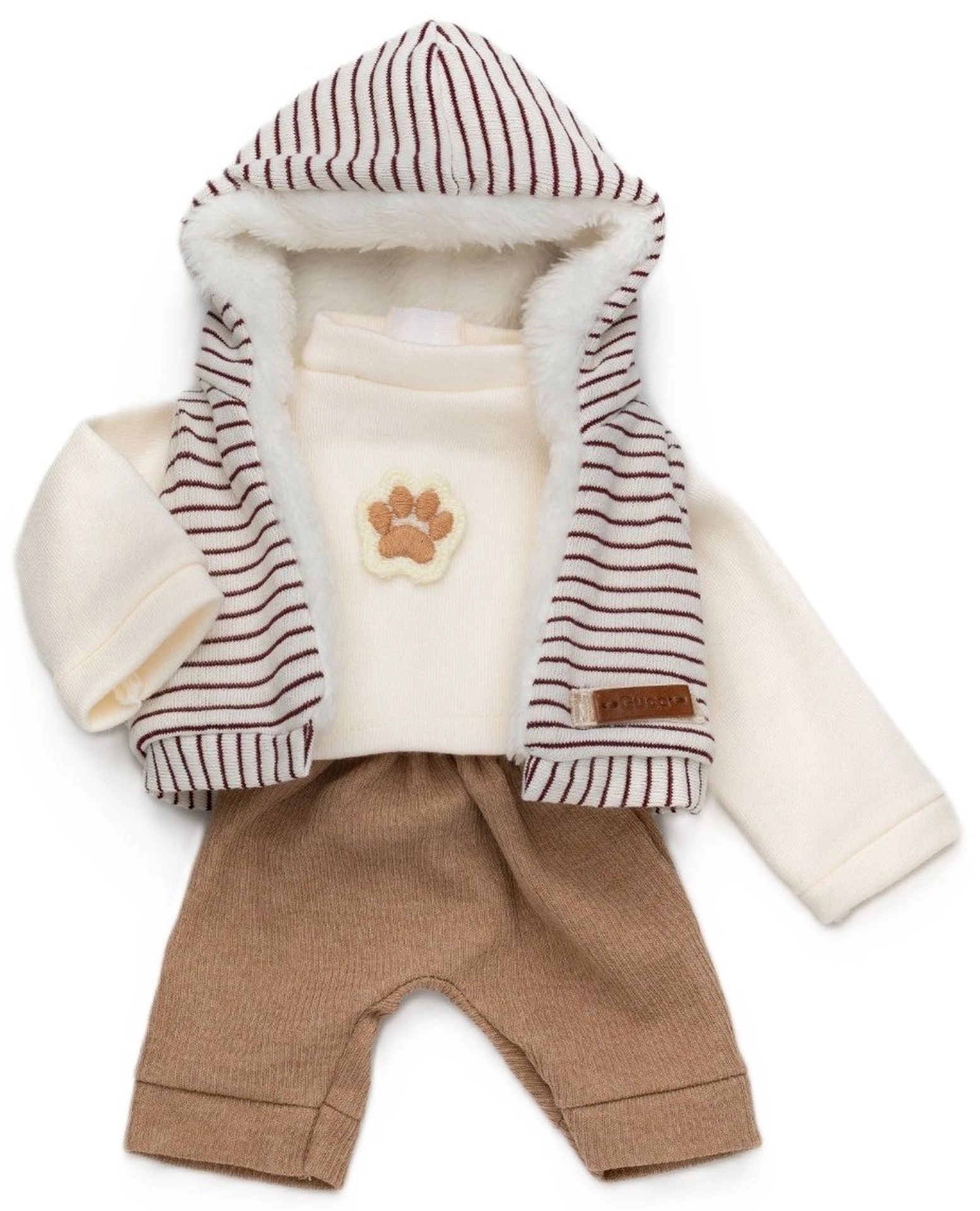 Deze stijlvolle set voor het Reborn-aapje van 32 cm bestaat uit drie op elkaar afgestemde items – een crèmekleurig T-shirt met lange mouwen en pootafdruk, een gestreept bodywarmpje met capuchon en warme voering, en een comfortabele broek. De outfit is ontworpen voor eenvoudig aan- en uitkleden, zodat kinderen snel de look van hun favoriete speelgoed kunnen veranderen.