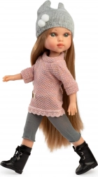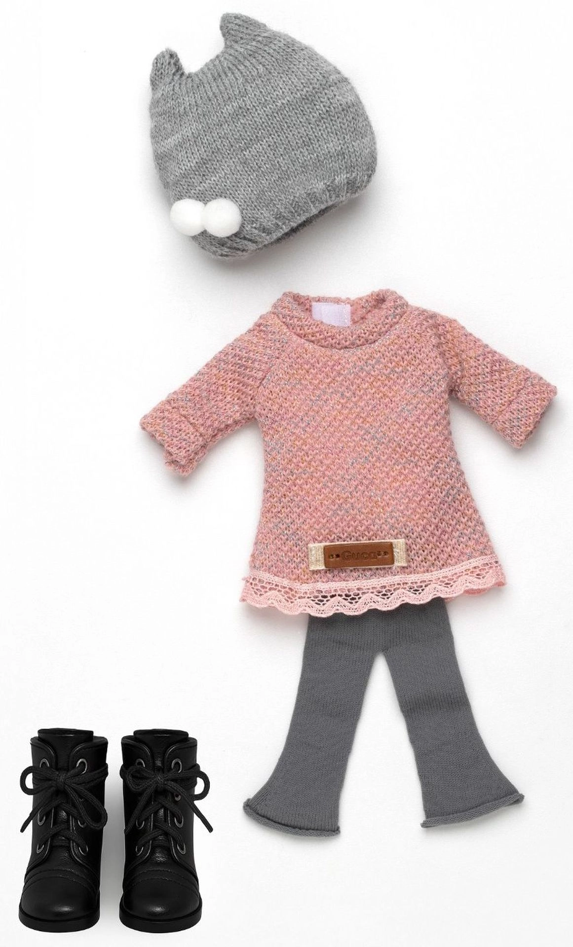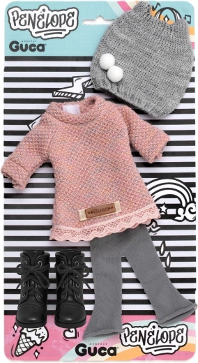 Geef je Penelope-pop van 34 cm een nieuwe garderobe. Deze handgemaakte set combineert een zachte gebreide look met comfort: roze tuniek met versiering, grijze uitlopende legging, grijze muts met twee pompons en zwarte veterschoentjes. De kleding past uitstekend en ondersteunt dankzij doordachte details creatief spel en styling.