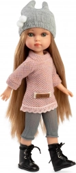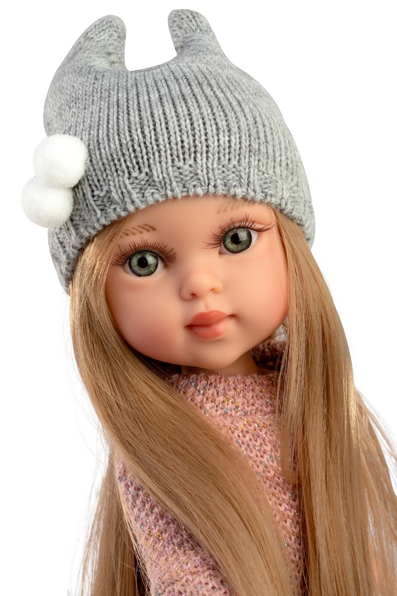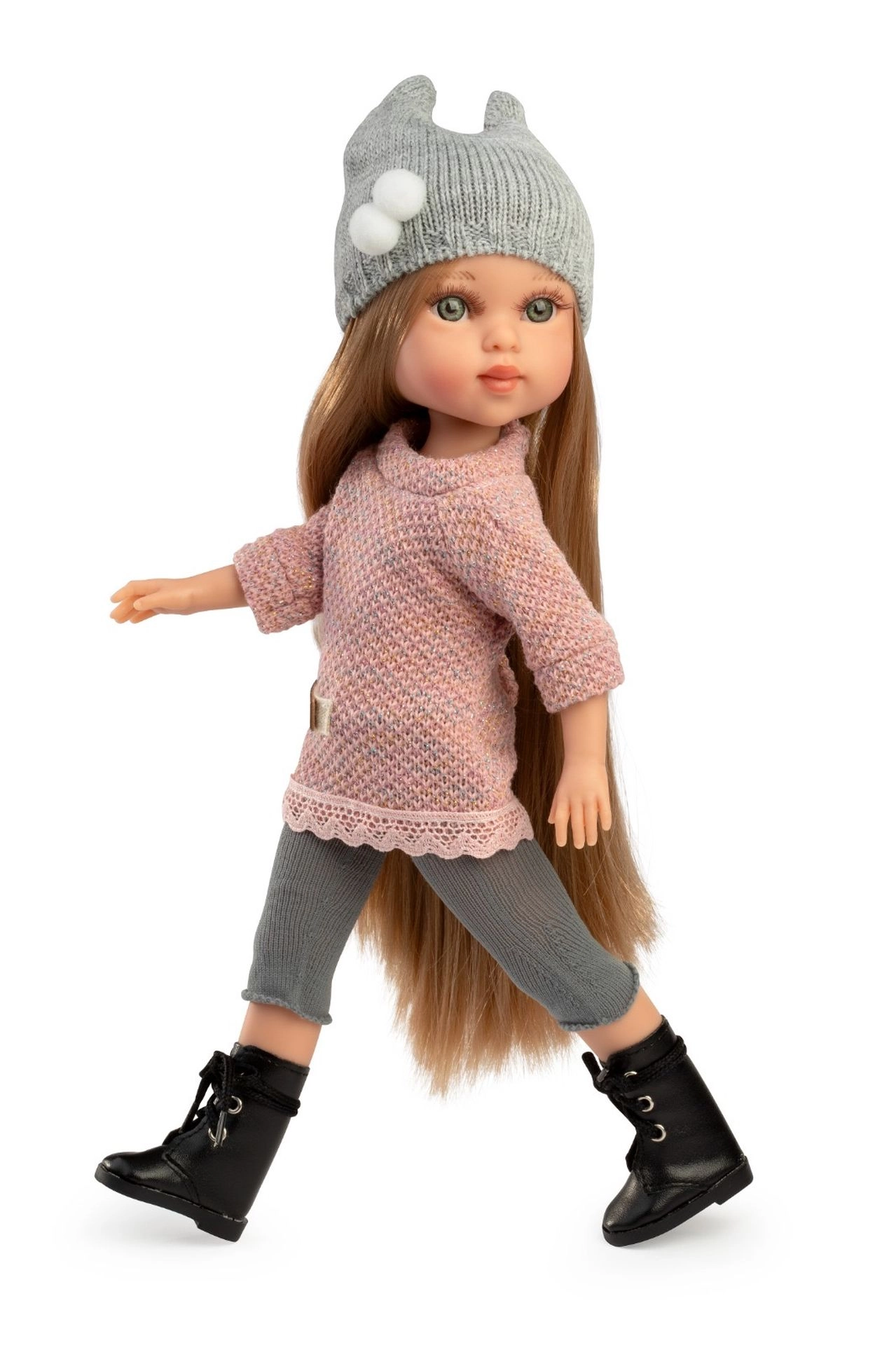 Stijlvolle 4-delige kledingset voor de pop Penelope 34 cm met tuniek, legging, muts en zwarte veterschoentjes. Handgemaakt in Spanje, hoogwaardige gebreide materialen en details voor realistisch spel. Ideaal om aan te kleden, te poseren en de fantasie van kinderen vanaf 3 jaar te stimuleren.