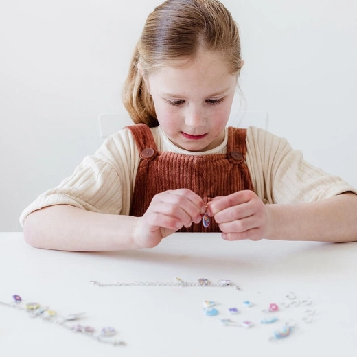 Maak je eigen magische armbanden met een eenhoornthema en glinsterende puffy hangers. De set bevat alles wat je nodig hebt voor eenvoudig knutselen en stimuleert creativiteit, fijne motoriek en plezier voor kinderen vanaf 3 jaar.