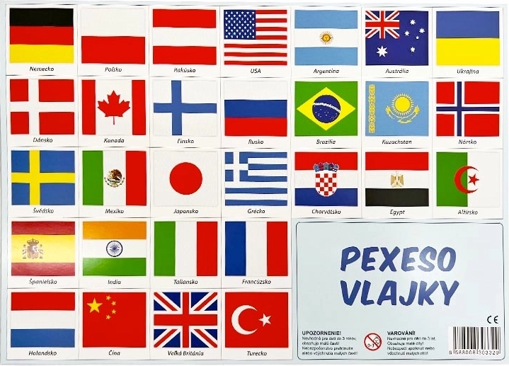 Een populaire gezelschapsspel voor kinderen en volwassenen dat het geheugen traint en de kennis van landen in de wereld vergroot. Bevat 32 paren met motieven van landenvlaggen, ideaal voor leerzaam plezier en spel met het hele gezin.