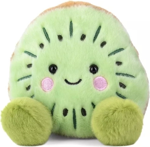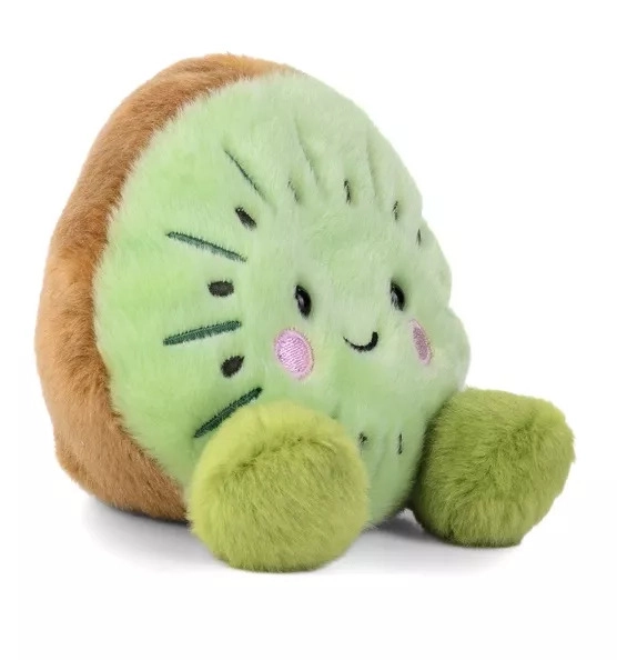 De Palm Pals pluche kiwi is klein maar uiterst schattig – een lichtgroene kern met kleine zaadjes, een bruine rand en zachte roze wangetjes geven hem een uniek karakter. Door het compacte formaat past hij comfortabel in je hand, perfect voor op reis, in de schooltas of op je bureau.